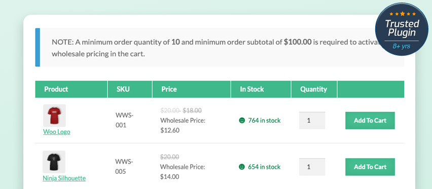 Wholesale Suite, the #1 WooCommerce Wholesale Solution. Easily Add Wholesale To Your WooCommerce Store. For: Wholesale Pricing, Multiple User Tiers, Product Visibility, Wholesale Order, Form Approvals System, Order Minimums, Tax Display Control, Shipping Mapping, + 100's Features. Ditch the spreadsheets & upgrade your wholesale business today! Wholesale Suite lets you bring your entire wholesale business online so you can streamline & make more profit. It gives your wholesale customers an amazing ordering experience alongside your normal retail store. Wholesale Pricing: Easily manage wholesale pricing across multiple levels by fixed price or percentage. Loads of pricing options. Product Visibility: Control product visibility by user role to make products & categories as wholesale or retail. Wholesale Tax Control: Satisfy your country's strictest tax requirements & control pricing/tax display as required by law.