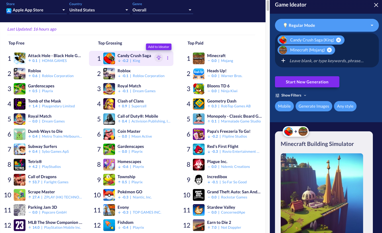 With the power of AI, Ludo.ai identifies and surfaces trends and patterns on te market, making it easier than ever to choose themes and content for your next hit game. Ludo.ai uses data-driven insights to help you stay on top of the market and invest in truly promising concepts, making our AI the perfect partner to enhance your ideation process. Unlock endless AI-generated ideas to fuel your creativity. Quickly generate new game concepts, elements, mechanics, and more to overcome creative stagnancy and redundancy. Game & image search, stats, top charts, image generation, and more – all consolidated in one destination for a truly efficient start to your game development journey. Ludo.ai aggregates games by topics and lets you know what’s trending. No more digging through top chart lists.