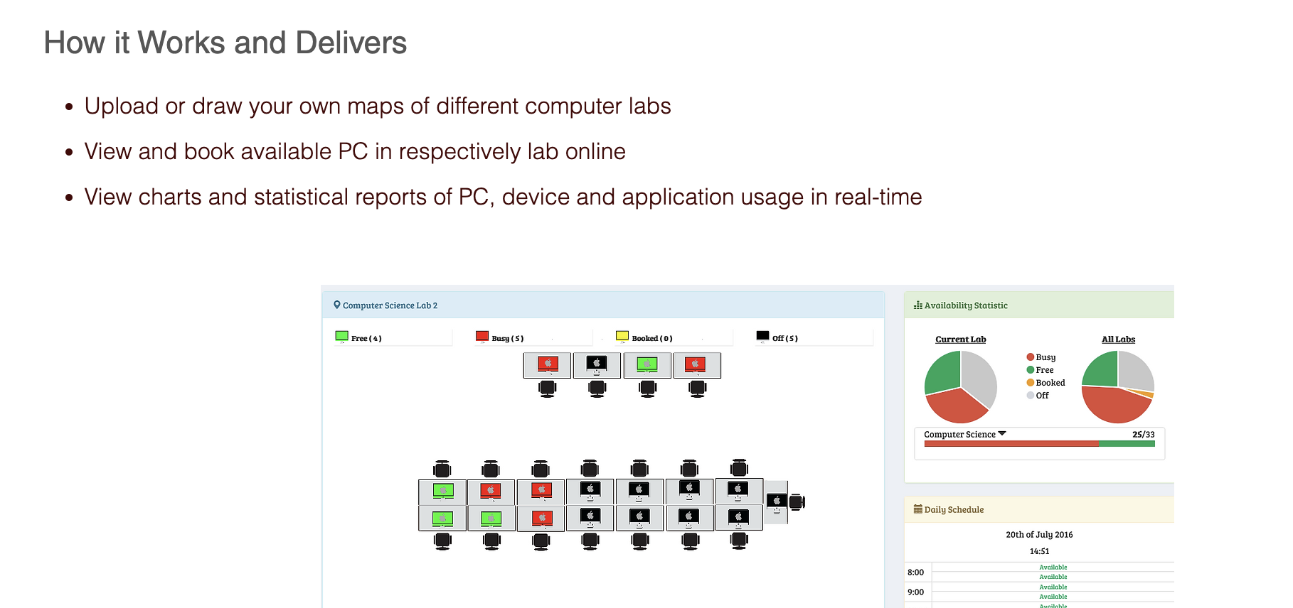 CloudDesk vMap is a lab management and monitoring tool that allows you to create visible lab map and schedules to be displayed and enable booking of PC in real-time. CloudDesk enables you to easily create maps of your computers labs with built-in smap-to-grid editor and device icons, and allows customization of your lab schedules and holidays. It is can be deployed on-premise or cloud-based (SaaS) for student to view status of availability of each computer in real-time, and book the required PC online. It enables tracking and gathering of usage data on devices, local and web-based applications, and reports can be exported in Excel format.