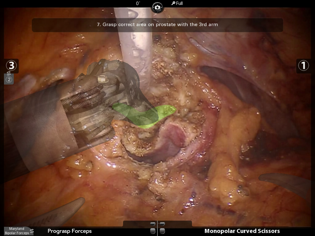 MaestroAR® provides procedure-specific learning in 3D augmented reality on both dV-Trainer® and FlexVR™ robotic surgery simulators. Based on recorded surgical procedures, MaestroAR® allows trainees to immerse themselves in the surgery by using the simulator to control virtual robotic instruments to interact with anatomical regions within the augmented 3D video. Maestro AR® provides opportunities to gain procedural familiarity and to develop decision-making skills. Narrated by influential, globally-recognized robotic surgeon educators, the trainee is guided through a complete robot-assisted surgical procedure, step by step. The trainee manipulates virtual 3D robotic instruments in order to answer questions about the procedure, identify and interact with anatomical regions, and perform virtual reality skills exercises.