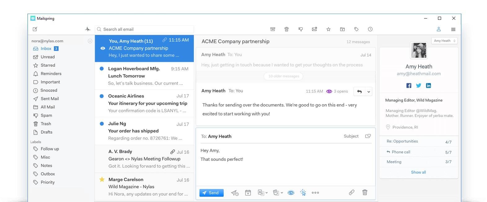 Boost your productivity and send better email with Mailspring, the best mail client for Mac, Linux, and Windows. Multiple accounts (IMAP & Office 365), touch and gesture support, advanced shortcuts, lightning-fast search, undo send, unified inbox, read receipts, link tracking, and more, mac, windows, and linux support, themes and layouts (including dark mode), localized into 9 languages. Mailspring indexes your mail so you can use advanced, Gmail-style search queries and search message contents across all your connected accounts. Never lose an email again. Understand your audience. Send timely follow-up. Turn clicks and opens into actionable insights. Mailspring Pro is your unstoppable email sidekick for sales and business. Mailspring Pro removes the limits in the free version, so you can snooze messages, schedule reminders, and send later an unlimited number of times and conquer your inbox. Understanding your contacts and customers is the key to connecting with them.