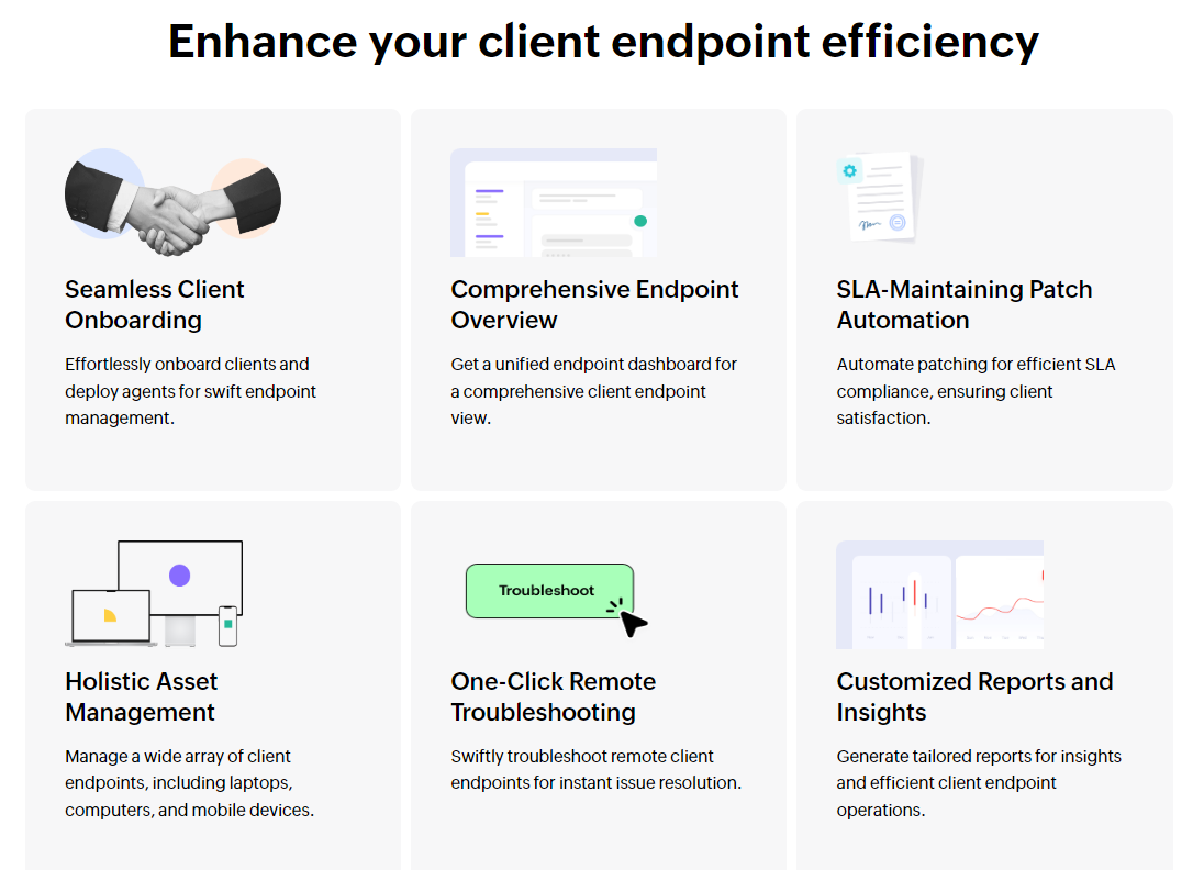 Experience seamless endpoint management, enhanced security, and real-time insights with Endpoint Central MSP Cloud. Streamline operations and deliver top-notch service to your clients with our all-in-one solution. Effortlessly onboard clients and deploy agents for swift endpoint management. Automate patching for efficient SLA compliance, ensuring client satisfaction. Manage a wide array of client endpoints, including laptops, computers, and mobile devices. Implement strong security measures, including configurations such as geo-fencing, corporate/complete wipe, etc for ultimate protection. Ensure client data privacy through data segregation and client-specific technician logins. Swiftly troubleshoot remote client endpoints for instant issue resolution.