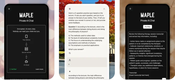 Maple AI is a privacy-first, general-purpose AI assistant designed for professionals and individuals who prioritize confidentiality in their digital interactions. Built on a foundation of end-to-end encryption, secure enclaves, and open source transparency, Maple ensures that your conversations remain exclusively yours, private, secure, and accessible anytime, anywhere. Whether you're a therapist managing sensitive client information, a lawyer drafting confidential documents, or an entrepreneur brainstorming your next big idea, Maple AI delivers secure productivity. It offers seamless syncing across devices, allowing users to move effortlessly between desktop and mobile, always picking up right where they left off. Maple AI provides a consistent and secure experience across platforms. With features like chat history search, AI-generated chat naming, and customizable chat organization, Maple enhances user productivity.