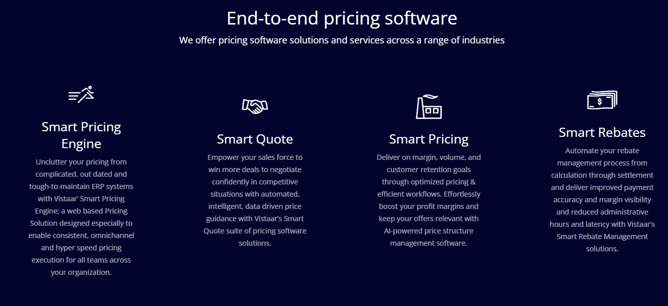 We offer pricing software solutions and services across a range of industries. A robust pricing solution adapts to your business environment, and ensures that it recommends optimum prices that fit with your pricing strategy. Pricing provides the fastest and most effective way for companies to increase margins. However, even companies who agree with this principle often find it difficult to implement pricing best practices with any consistency and lasting impact. Vistaar Pricing Optimization and Management Solutions are designed keeping this in mind.The solutions provide a collaborative platform that enables fast and easy configuration to ensure that you get the right fit for your organization with the quickest time-to-value. Vistaar’s Smart Rebate offers next-generation capabilities that help you improve the effectiveness of your rebate management programs, and reduce the labor associated with program execution. It relies on Machine learning to churn out new insights.