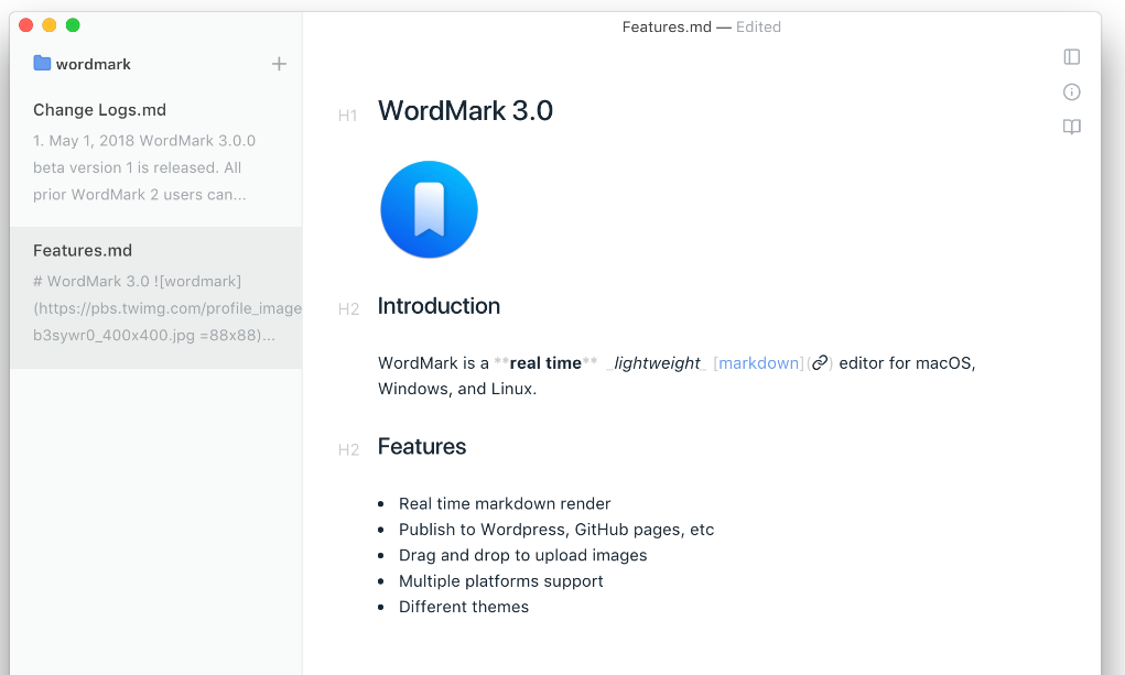 A real time Markdown editor for bloggers. It supports multiple platforms, and stands out with it's beautiful design, various features, and focus on details. WordMark supports Mac, Windows, and Linux system. Supports multiple color themes, recognizes YAML Front matter. Quick publish to multiple platforms including Wordpress and GitHub pages. Drag and drop to upload to pre-selected image services. You can easily parse TODO list. Includes multiple themes, YAML front matter, publishing options, TODO lists, and the option of uploading images.