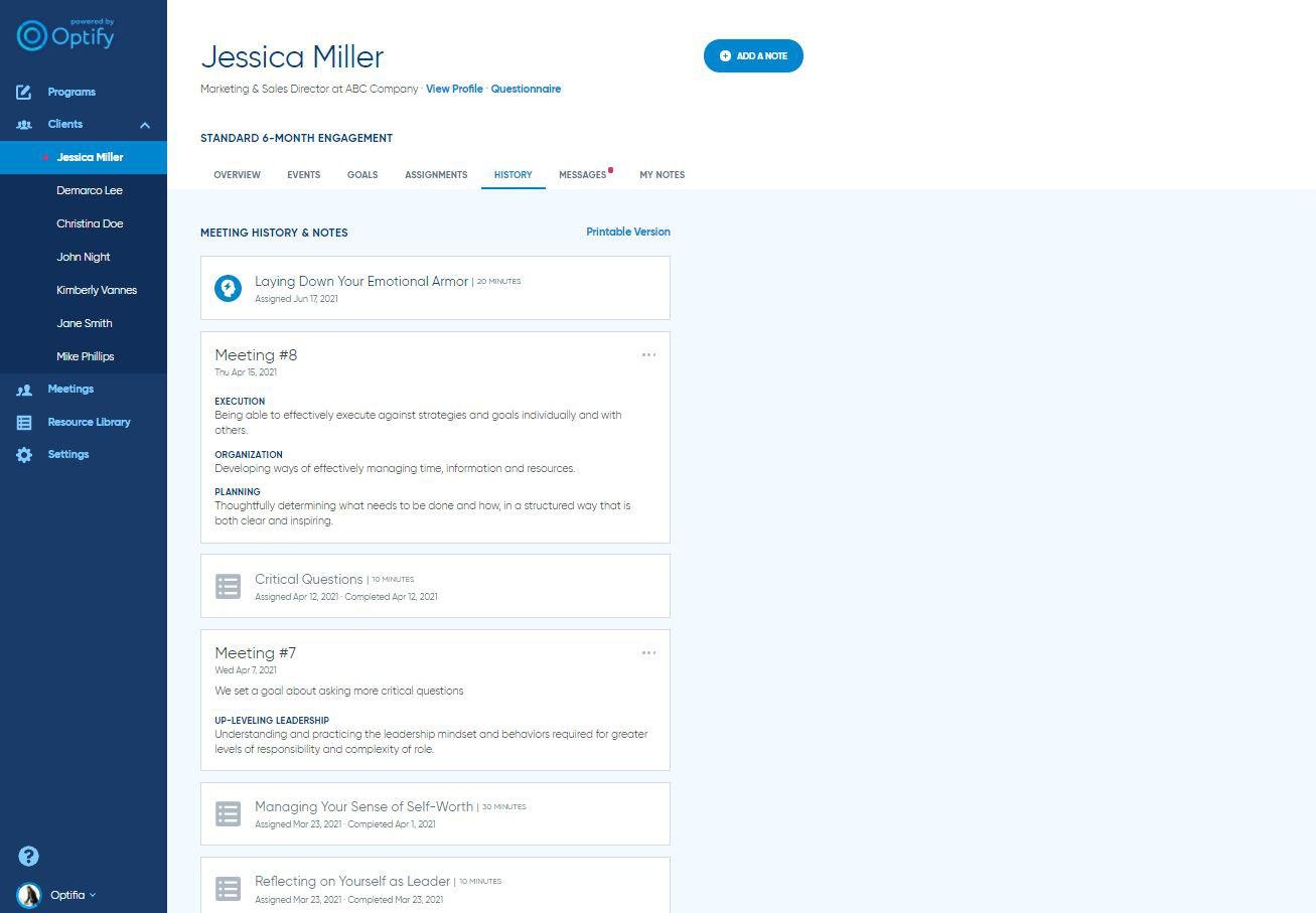 If you’re a solo coach, coaching team, or running an internal coaching program, you can easily use Optify to securely manage programs, honoring confidentiality and providing coaches, clients, and program managers only what they need. From custom program design to coach matching to the customizable library of learning resources, you’ll have what you need to level up your practice.