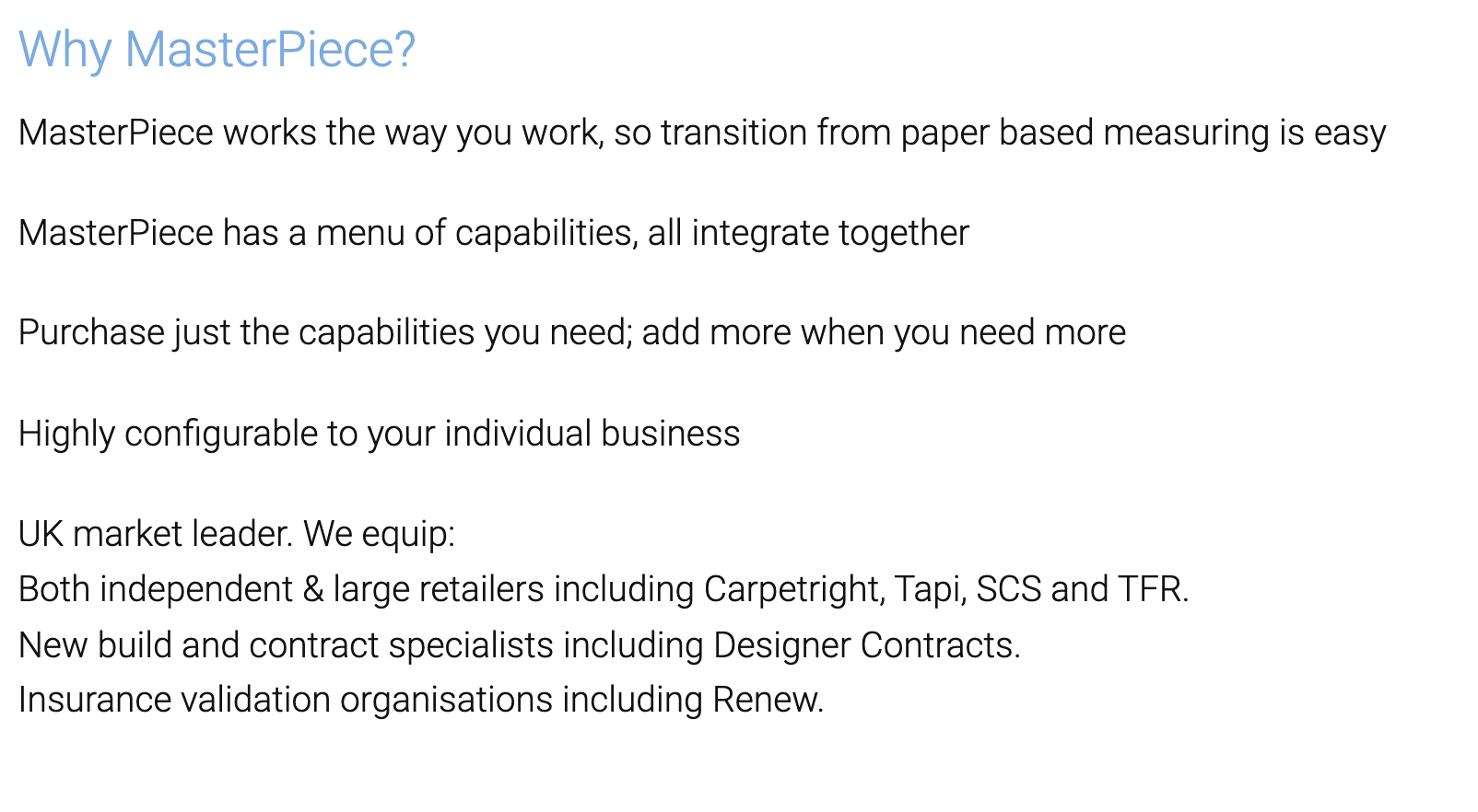MasterPiece is estimating software for floor coverings for retail, shop-at-home and commercial/new build. It supports your flooring business from first contact with the customer to completion, both in the store and on the road. For retail, the MasterPiece flooring software makes measuring and planning of carpets and floor tile layout planning and estimating easy. MasterPiece supports the selling process towards closure of the sale, via automated costing, emailed estimates, reduced wastage, and rapid application of discounts. For contract flooring operations, measurements take-off is simply a matter of tracing around the PDF/CAD floor plans on screen, saving considerable time and reducing waste – the ideal flooring contractor software.
