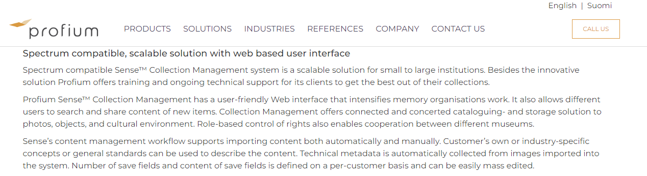 Profium develops an easy-to-use cloud-based Profium Sense™ Collection Management system for museums, trusts, foundations, and memory institutions. We have operated for over two decades in close collaboration with museums to ensure that the system fulfills requirements in the future as well. The features of this system are available for you quickly as it is provided as a Software as a Services (Saas) model from a secure hosting facility and can be accessed with your current personal computers without the need for any hardware investments. Spectrum-compatible Sense™ Collection Management system is a scalable solution for small to large institutions. Besides the innovative solution, Profium offers training and ongoing technical support for its clients to get the best out of their collections.