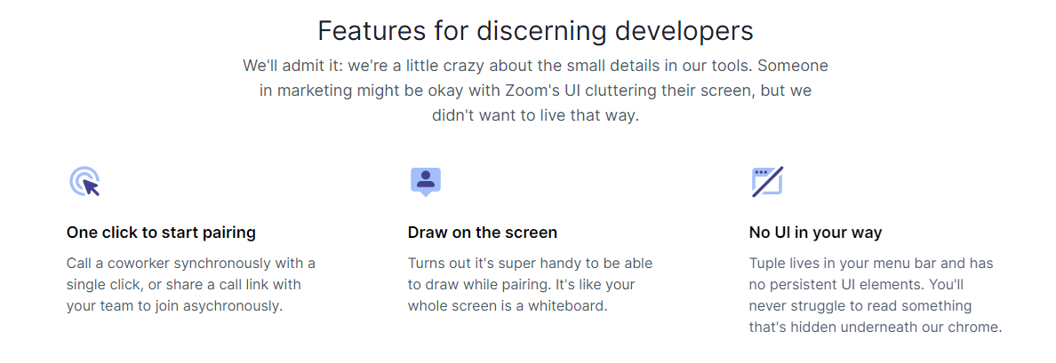 The best remote pair programming app on macOS. Because we programmers deserve better than a generic screen sharing tool. Once upon a time, there was an amazing pairing app called Screenhero. Sadly, they decided to sell to Slack, who tried to integrate them, failed, and eventually shut them down. In the following years, we made do with generic screensharing tools. It's not terrible pairing over Zoom, but it was clearly built for business types. They even call it a “meeting” in their UI. And Slack Calls is fine, but not having remote control is a deal-breaker. Have you ever tried to dictate some code for your pair to write? Or narrated a set of Vim commands? Not fun.