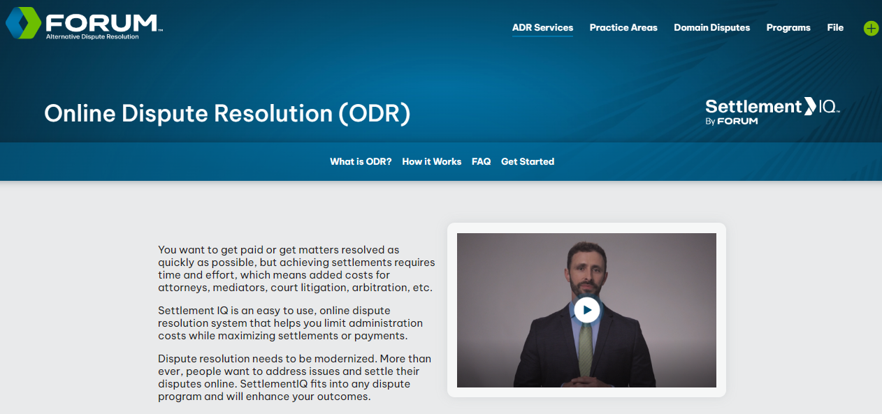 FORUM is a leading provider of Alternative Dispute Resolution (ADR) services, specializing in arbitration, mediation, and online dispute resolution (ODR) through its platform, SettlementIQ. SettlementIQ is a fully online system designed to streamline the dispute resolution process, reducing administrative costs while maximizing settlements or payments. It offers various methods for dispute resolution, including blind bidding, direct online negotiations, and neutral assistance, all conducted within a secure online environment. SettlementIQ can be integrated with arbitrators, mediators, or experts, depending on the specific requirements of the dispute. It is particularly beneficial for industries such as insurance, debt recovery, business-to-business transactions, and general ADR, providing a more efficient and cost-effective alternative to traditional dispute resolution methods.