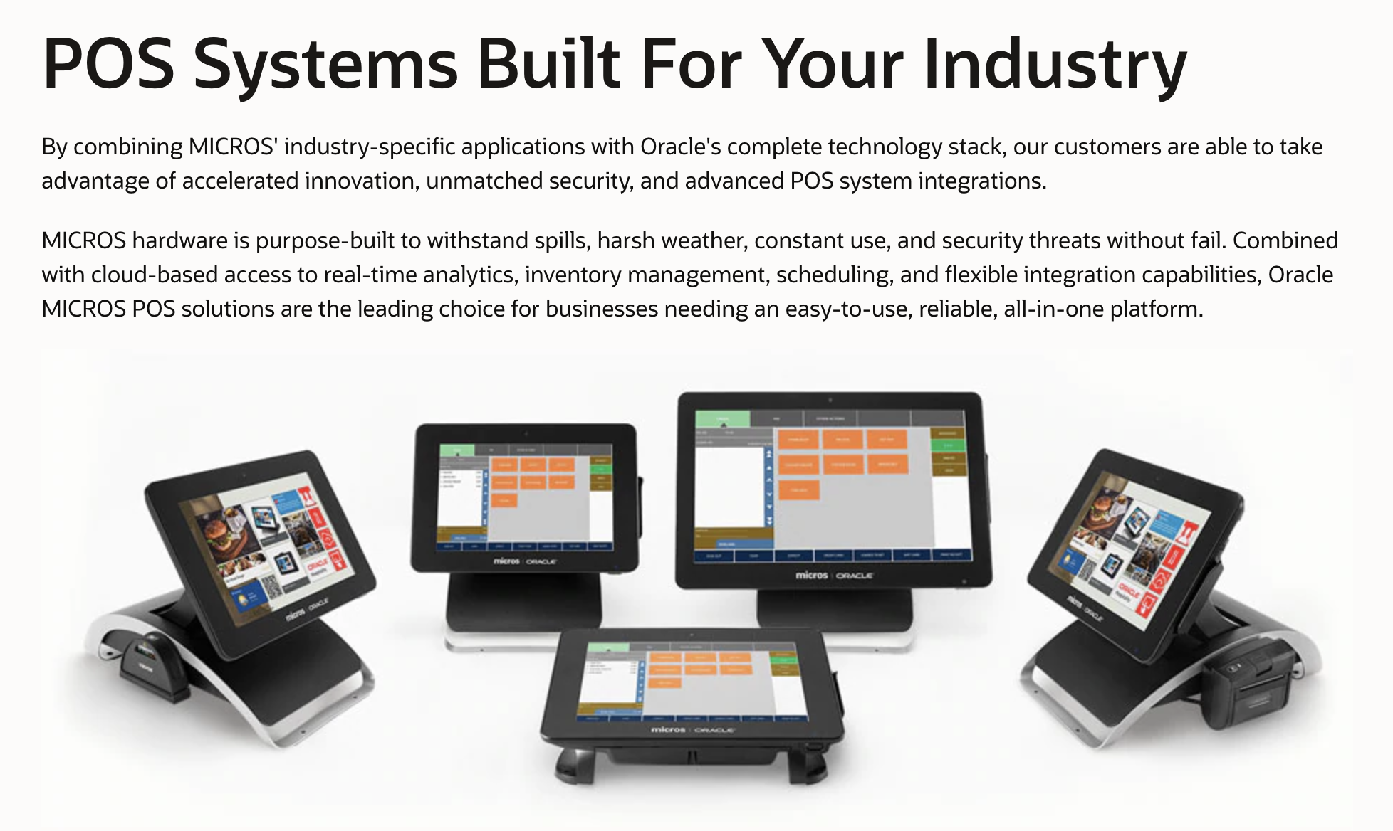 Oracle MICROS provides stable, reliable, and secure point of sale (POS) systems for restaurants, hotels, resorts, casinos, stadiums, arenas, cruise ships, transportation hubs, and retail stores around the globe. As a global leader in POS hardware, software, open integrations, and innovation, Oracle MICROS also maintains a 40-year tradition of excellence in consultation and support services for its cloud-based and on-premise POS customers across 180+ countries. By combining MICROS' industry-specific applications with Oracle's complete technology stack, our customers are able to take advantage of accelerated innovation, unmatched security, and advanced POS system integrations. MICROS hardware is purpose-built to withstand spills, harsh weather, constant use, and security threats without fail. Combined with cloud-based access to real-time analytics, inventory management, scheduling, and flexible integration capabilities, Oracle MICROS POS solutions are the leading choice.