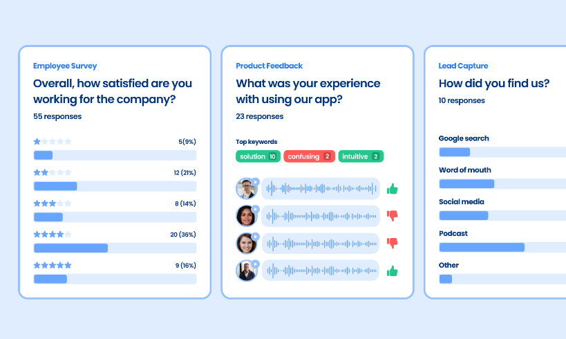 The Voiceform platform offers easy-to-use templates to get started, and help you create surveys, forms and workflows that can be shared in multiple languages. Share your forms via email, chat, embed or widget. Access rich data analysis tools like sentiment, thematic and topic extraction.