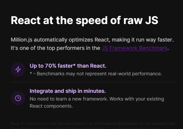 Million.js introduces a novel "block" virtual DOM. It's significantly faster than React's virtual DOM, as it diffs data instead of the DOM. Million.js uses a custom compiler that automatically optimizes your React components on the server. Tired of learning new frameworks and big migrations? Million.js ships a drop-in automatic mode to make your React apps faster, without any code changes. We use a novel approach to the virtual DOM called the block virtual DOM. You can read more on what the block virtual DOM is with virtual DOM, back in block and how we make it happen in React with behind the block(). We are actively working on removing these limitations. It's also important to note that your application may not need Million.js – if your app is not UI heavy, you may not see much performance improvement.