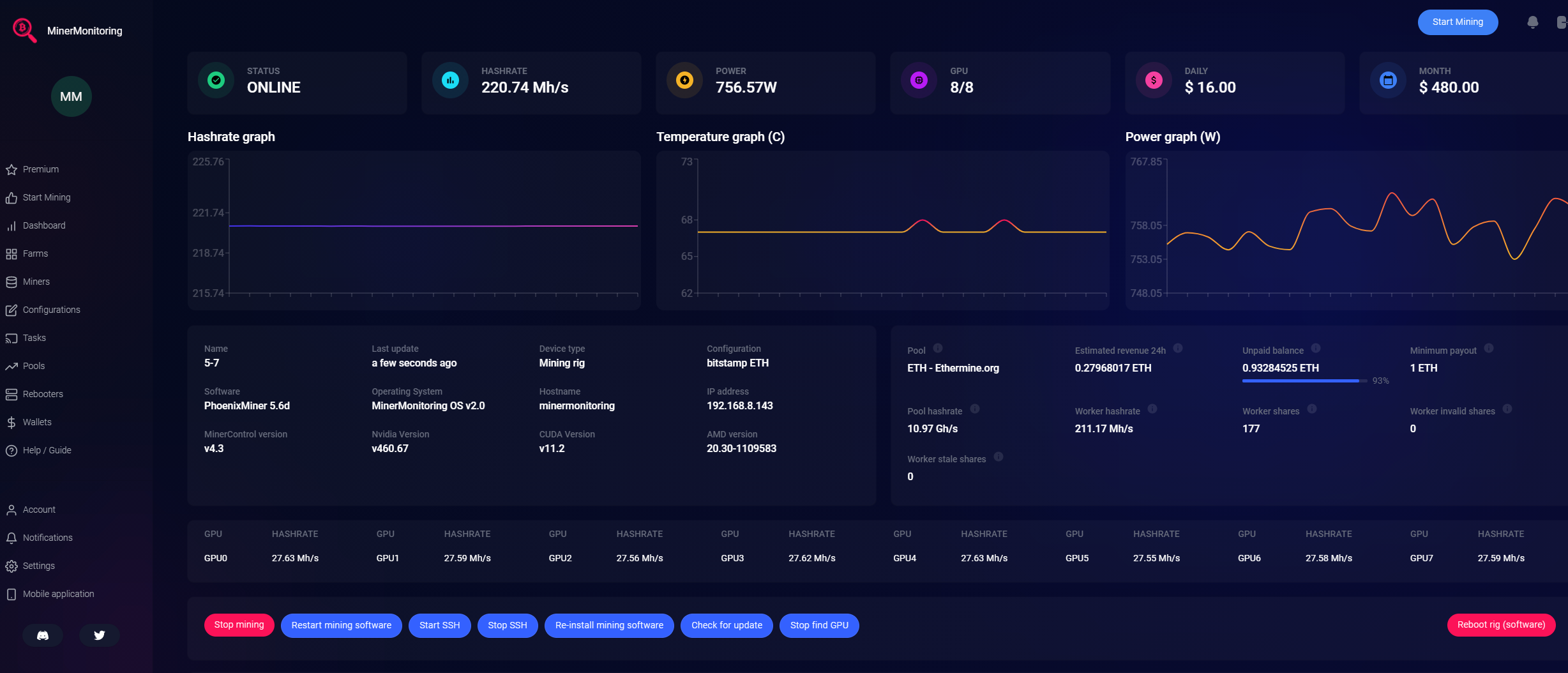 MinerMonitoring.com offers monitoring and controlling your crypto mining rigs over iOS, Android or via web. Have full control and overview of your mining rigs online with few easy clicks. Supported are both Linux and Windows operating systems.