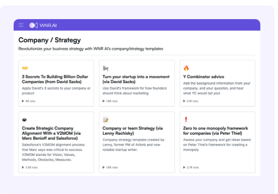 Supercharge ChatGPT with templates from top CEOs. Build your own templates with GPT-4. Simplify complex product management tasks with our user-friendly templates. Revolutionize your business strategy with the top company/strategy templates. Templates for both investors and founders to analyze companies using the top VC frameworks. We promise you will do more high-quality work this month, than ever before. You will save at least 10 hours on busywork, analyzing, editing, and overthinking. Design intelligent customer support and sales agents that chat live with your customers. Product requirement documents, project stories, and product-led acquisition. We have everything from "Lenny's List." Company strategy, vision alignment, Amazon working backward framework. Use these to refine the most important decisions. Sales templates, case studies, and outbound emails as recommended by YC, close.com, and other top sales organizations.