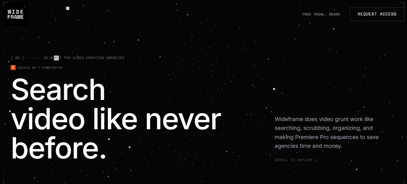 Wideframe is an AI agent designed to accelerate the large portion of video production work that happens outside the traditional non-linear editor. It analyzes and indexes entire footage libraries using transcripts, scene detection, and semantic understanding, so every frame becomes searchable without manual tagging or scrubbing. Users can query their media in natural language, instantly finding clips by meaning rather than filenames, and the system behaves like a virtual assistant editor that understands the full context of connected projects. Wideframe converts creative intent into action by automatically pulling selects, building bins, and assembling Premiere Pro–ready rough cuts in minutes, dramatically reducing pre-edit workload. It also generates research briefs, scripts, and contextual media assets grounded in the user’s own footage to avoid generic AI output.