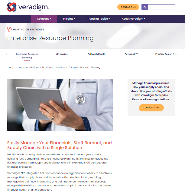 Healthcare has navigated unprecedented changes in recent years and is evolving fast. Veradigm Enterprise Resource Planning (ERP) helps to reduce the risk that comes from supply chain disruptions, clinician and staff burnout and financial pressures. Veradigm ERP Integrated Solutions enhance an organization’s ability to effectively manage their supply chain and financials with a single solution, enabling managers to gain new insight into and gain better control over their success, along with the ability to manage expense and capital that is critical to the overall financial health of an organization. Veradigm Fiscal Management is an easy-to-use account payable, general ledger, project management, and fixed asset solution that helps your organization streamline processes, eliminate paperwork, analyze data, and identify substantial cost savings throughout the enterprise. Offers same-day electronic payments to automate the payment process.