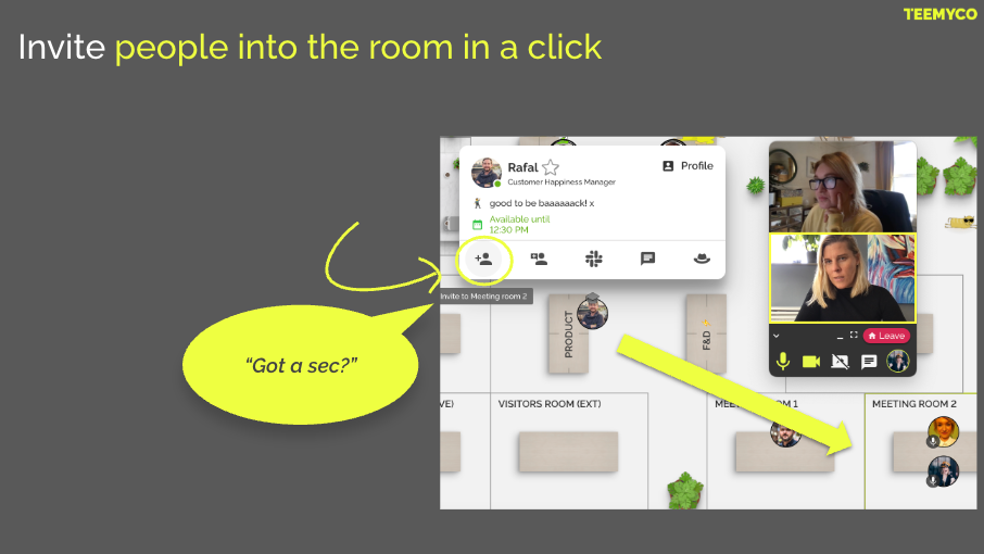 Invite external guests to visit you, see who is available and what they are up to in the office. Hop into a room and start ad-hoc conversations seamlessly, just like you would in a physical office. Humanize your digital work and collaborate more efficiently than ever.