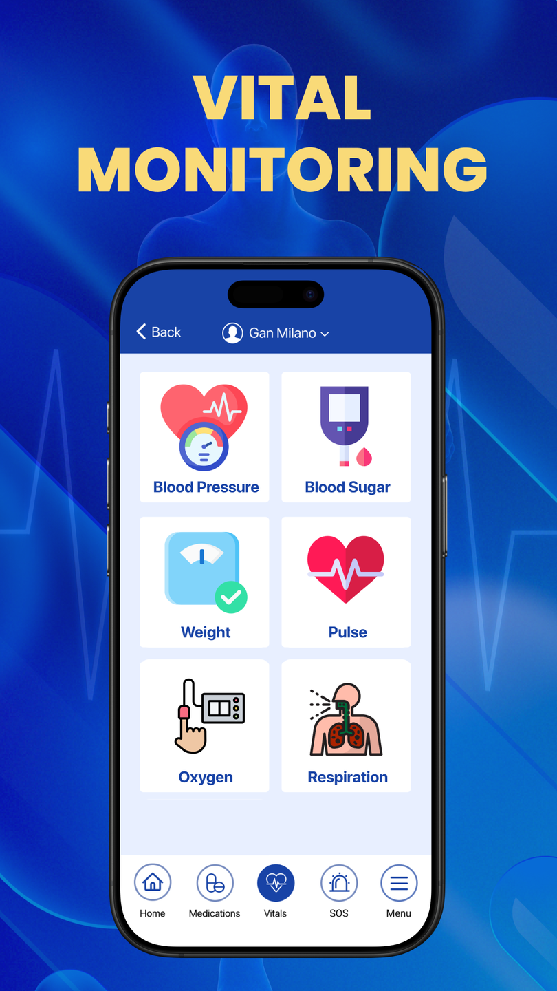 Set smart pill reminders, track blood pressure, sugar, and vitals with a personalized wellness score. Use voice commands for hands-free interaction. Send instant alerts to family members and caregivers with the SOS feature during emergencies. (including 24/7 support & emergency dispatch team)