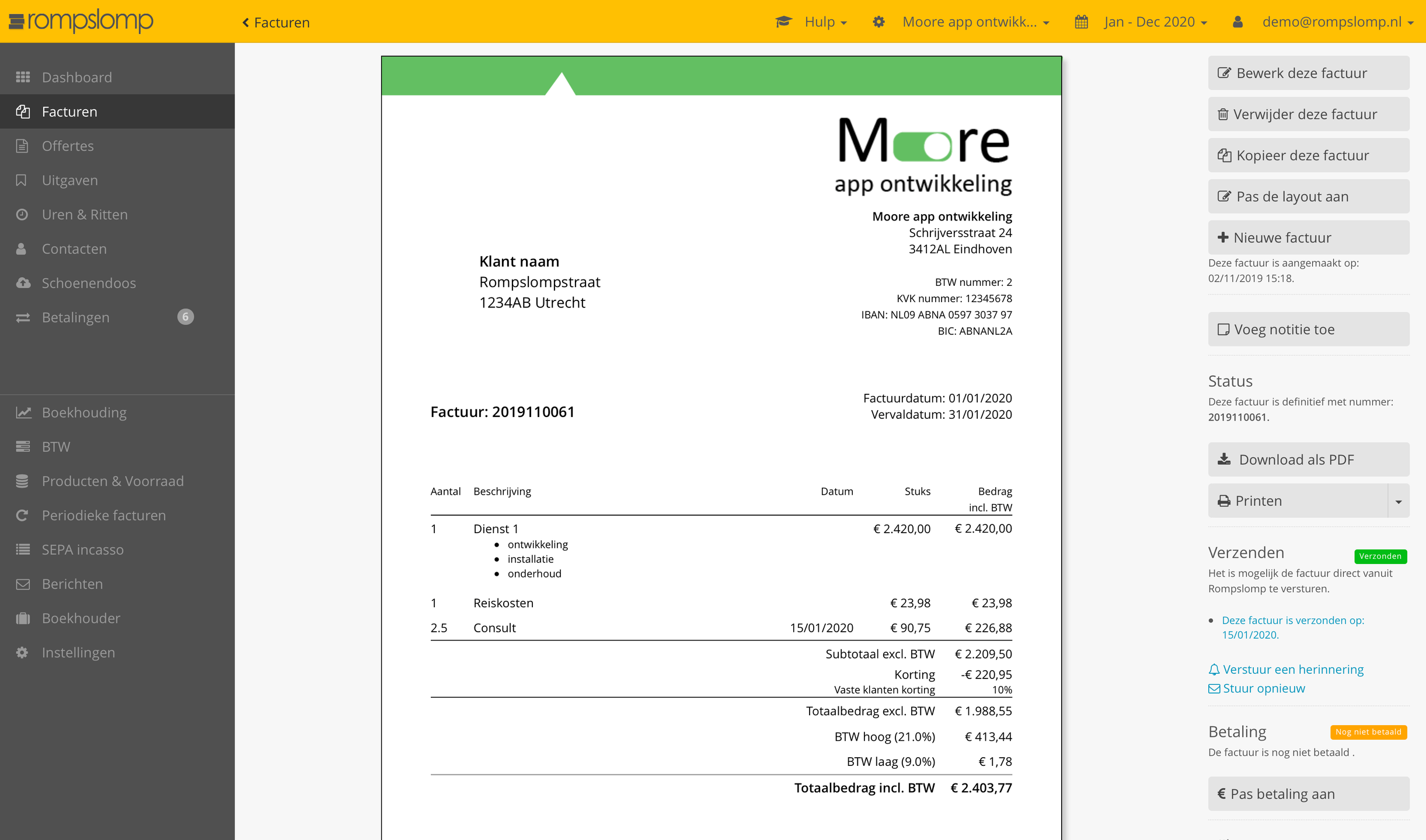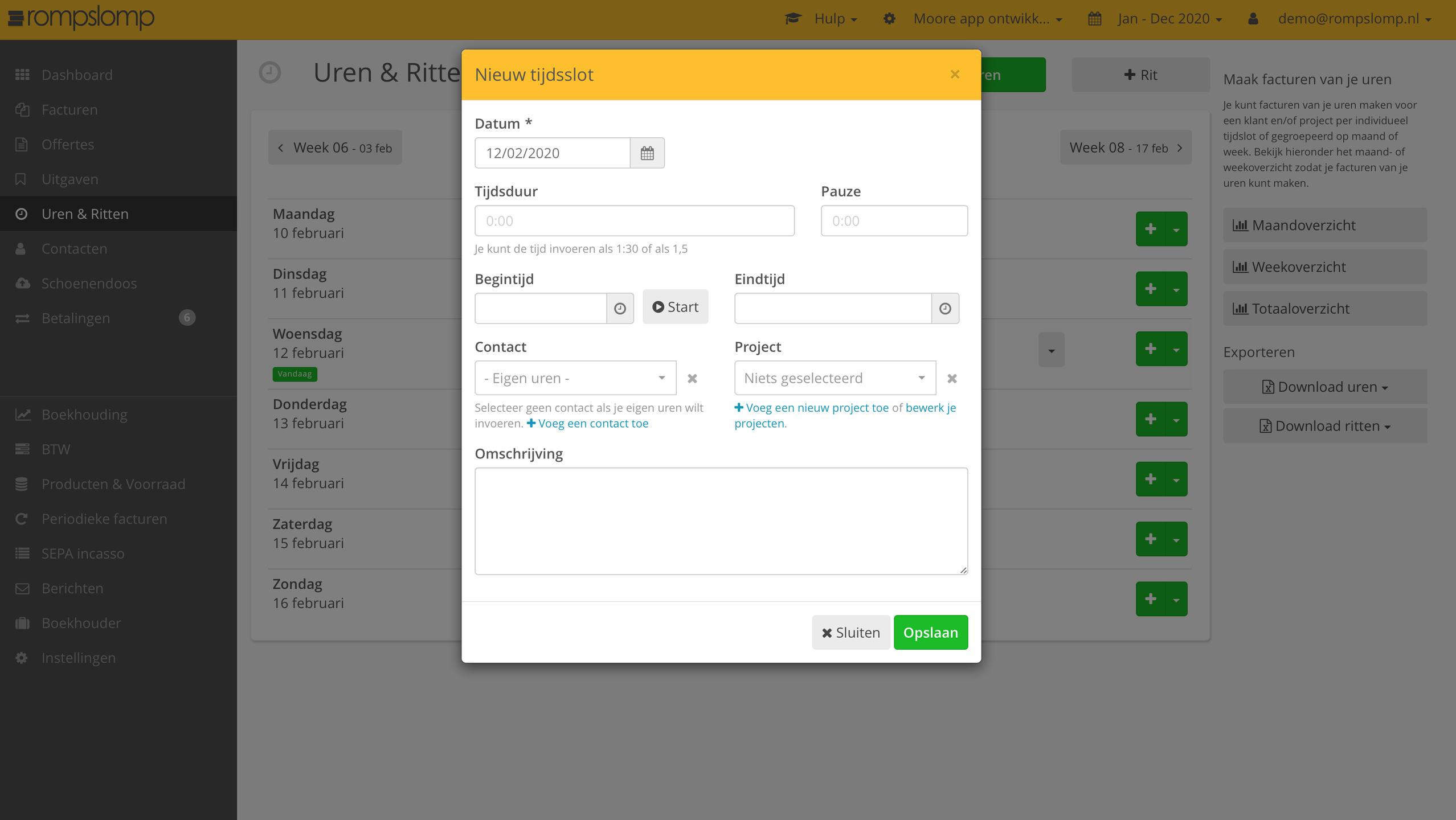 Rompslomp is the simple accounting program specially designed for entrepreneurs / self-employed workers / freelancers who prefer to do business. Rompslomp aims to make online accounting as easy as possible for you, this saves you a lot of time! Effort is not a traditional administration program, it works much easier than other accounting software, especially for self-employed persons / one-man businesses, but BVs, (sports) associations and foundations also do their accounting with Effort. At Rompslomp you don't have to deal with general ledger accounts and other accounting terms, we do this for you. Create an invoice with your own logo that will immediately be processed in your accounting, or scan your receipt with our Android or iPhone / iPad app and put it in the "shoe box", after which you have to do it in an instant if you have to submit your VAT return processed. In addition to the fact that it always works on your laptop, it is also available as an Android and iPhone.