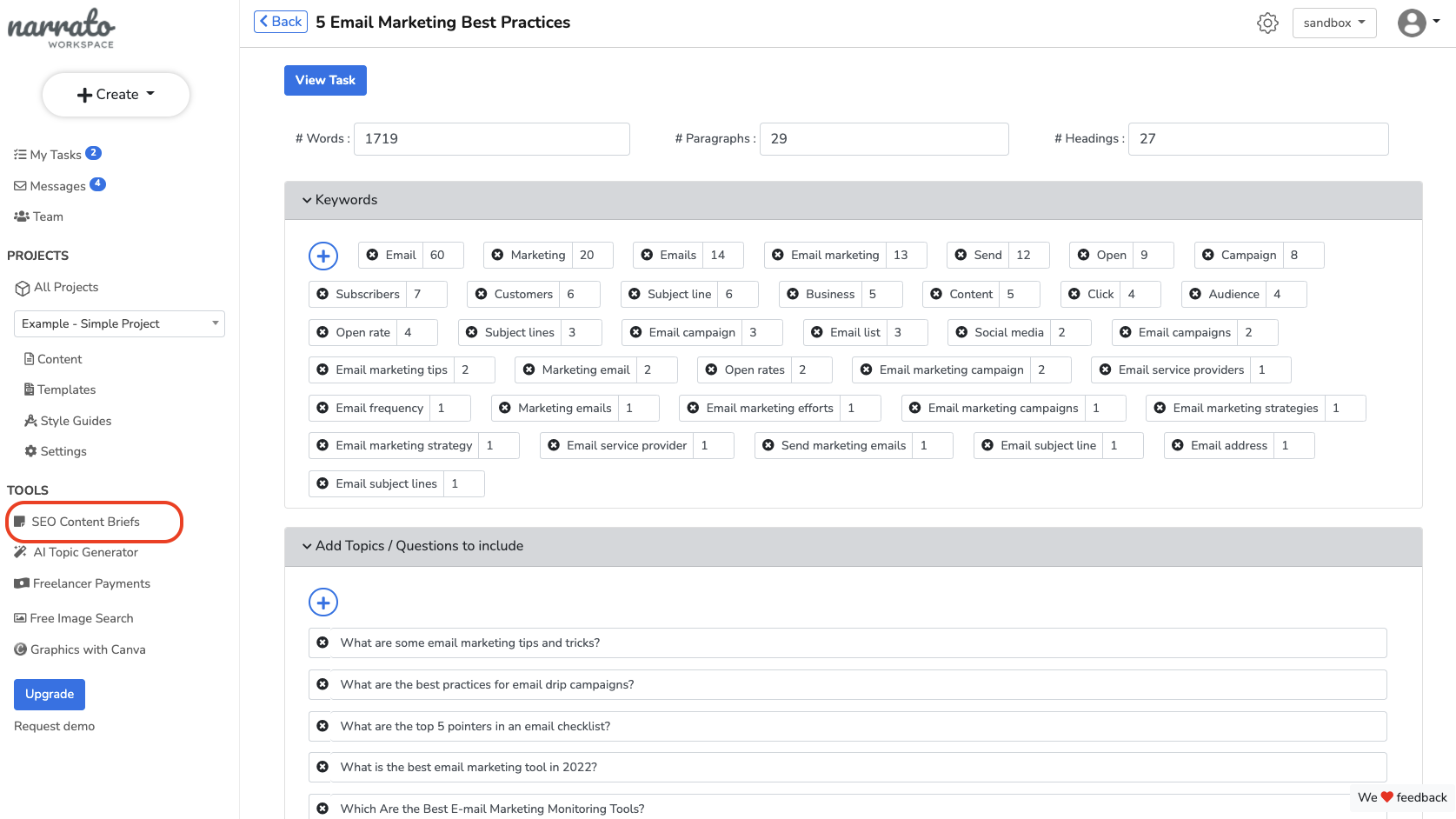 Narrato platform has been built for the busy marketers and business owners. It's simple to get started, place and track orders, and get high quality content quickly. Order 1 or 1000 content pieces with one easy order form. Share content guidelines in a simple, flexible format. Get your content jobs matched to the best and the most relevant writers by our smart algorithms. Or select and float your jobs to preferred writers. Start receiving content in 24-48 hours. Enjoy unlimited revisions, with every revision request turned around in 24 hours. Long or short articles, our writers can handle all formats and offer top quality. Hire article writers across industries. Hire experienced blog writers for audience-focused, engaging blog posts. We have writing experts across industries.