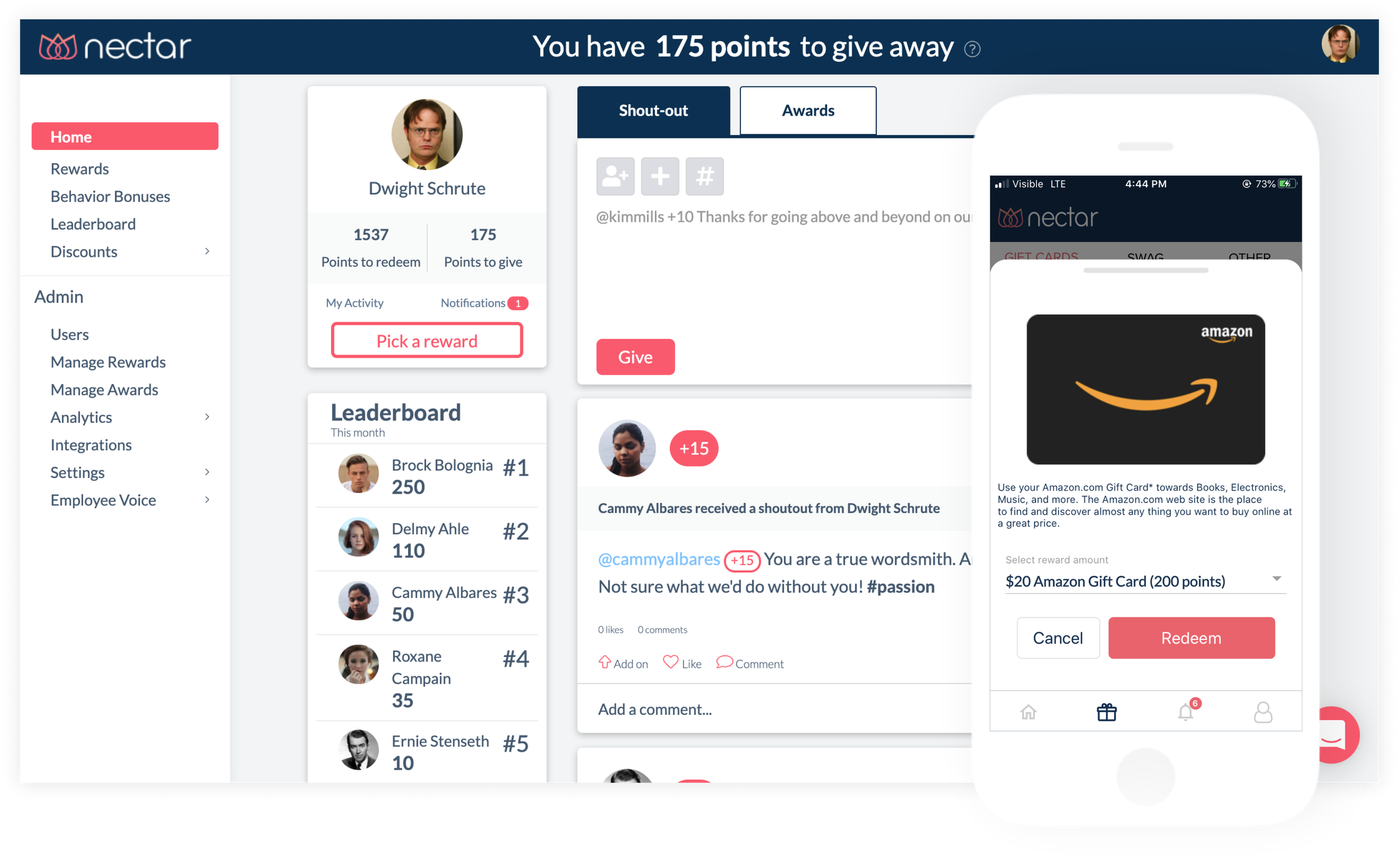 Our recognition & rewards platform enables everyone (peer to peer & manager to employees alike) to send meaningful recognition rooted in core values. Nectar has the most extensive rewards catalog so users can choose from company branded swag, Amazon products, gift cards or custom reward types. Integrate with your other tools like Slack and Teams to make sending recognition easy. We support top organizations like SHRM, MLB, Redfin, Heineken and more.