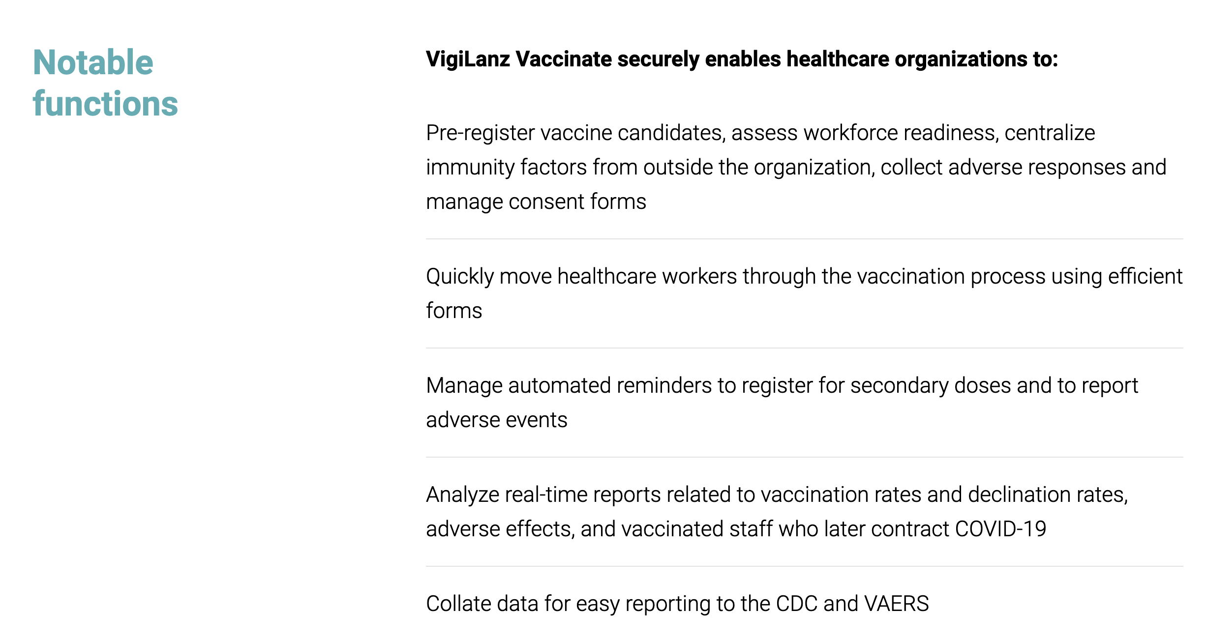 VigiLanz Vaccinate provides end-to-end management of your entire vaccination process – supporting mass vaccination events while managing organizational COVID-19 risk. Enable healthcare workers to easily register and provide consent. Eliminate manual data entry and automate workflows for program administrators. Reduce vaccine waste with real-time insights into volume needs based on scheduling and demand. Gain real-time visibility into vaccination and immunity rates at the individual, department, hospital, and enterprise-level. Automate data collection for CDC and state reporting, including for adverse side effects. Pre-register vaccine candidates, assess workforce readiness, centralize immunity factors from outside the organization, collect adverse responses and manage consent forms. Quickly move healthcare workers through the vaccination process using efficient forms. Manage automated reminders to register for secondary doses and to report adverse events.