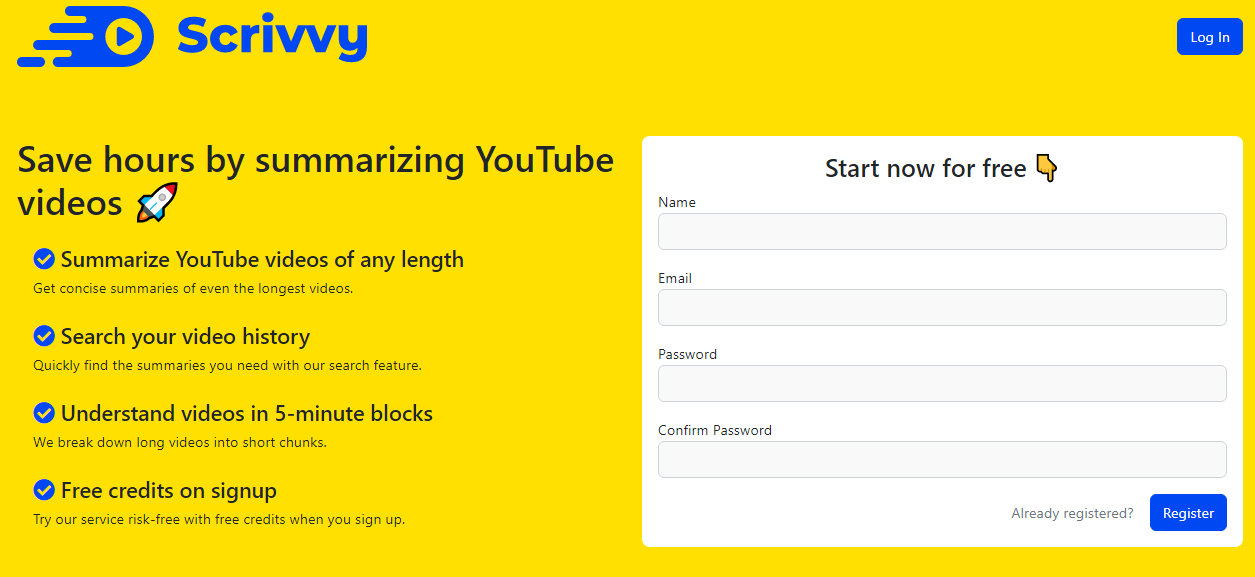 Save hours by summarizing YouTube videos. Get concise summaries of even the longest videos. Quickly find the summaries you need with our search feature. We break down long videos into short chunks. Try our service risk-free with free credits when you sign up. Understand videos in 5-minute blocks. Search your video history. Summarize YouTube videos of any length and get free credits on signup.