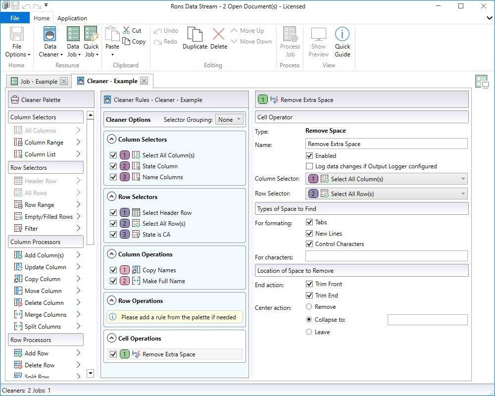 "Cleaners" are made up of a list of operations that are selected from a broad list of Column, Row and Cell processing rules. They can be built, saved and applied to as many data sources as required, and re-used with as many Jobs as needed. The Preview window displays both the original data and a preview of the processed data. The result of each rule is therefore very clear and comprehensible.