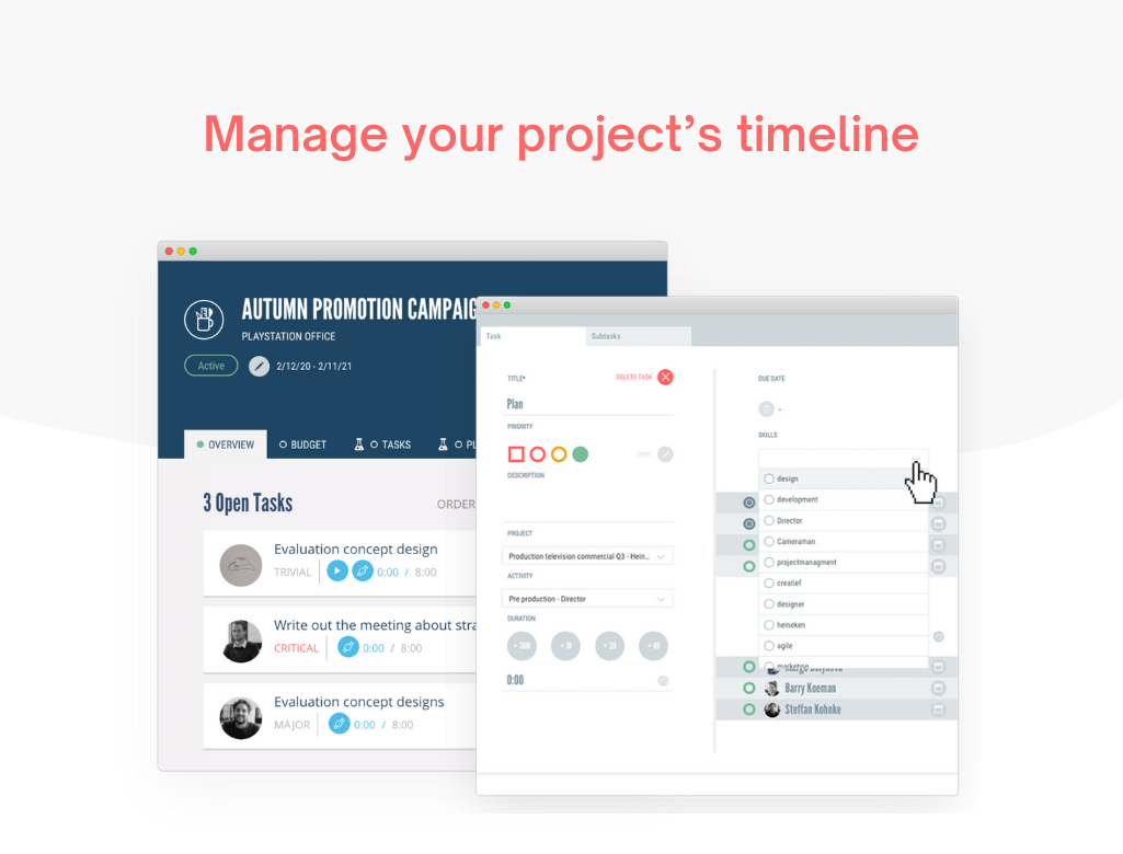 With just a few clicks, project managers can transform budgets into planning and turn tasks into time activities. Budgets can be split into phases or time activities based on each project requirement, allowing you to create and send estimates and invoices directly from the platform — and can also integrate with Quickbooks. When assigning tasks, you have the ability to select team members by skill and especially too and Rodeo's built-in time tracking feature allows users to log the hours they've spent on each task to help projects stay on track.