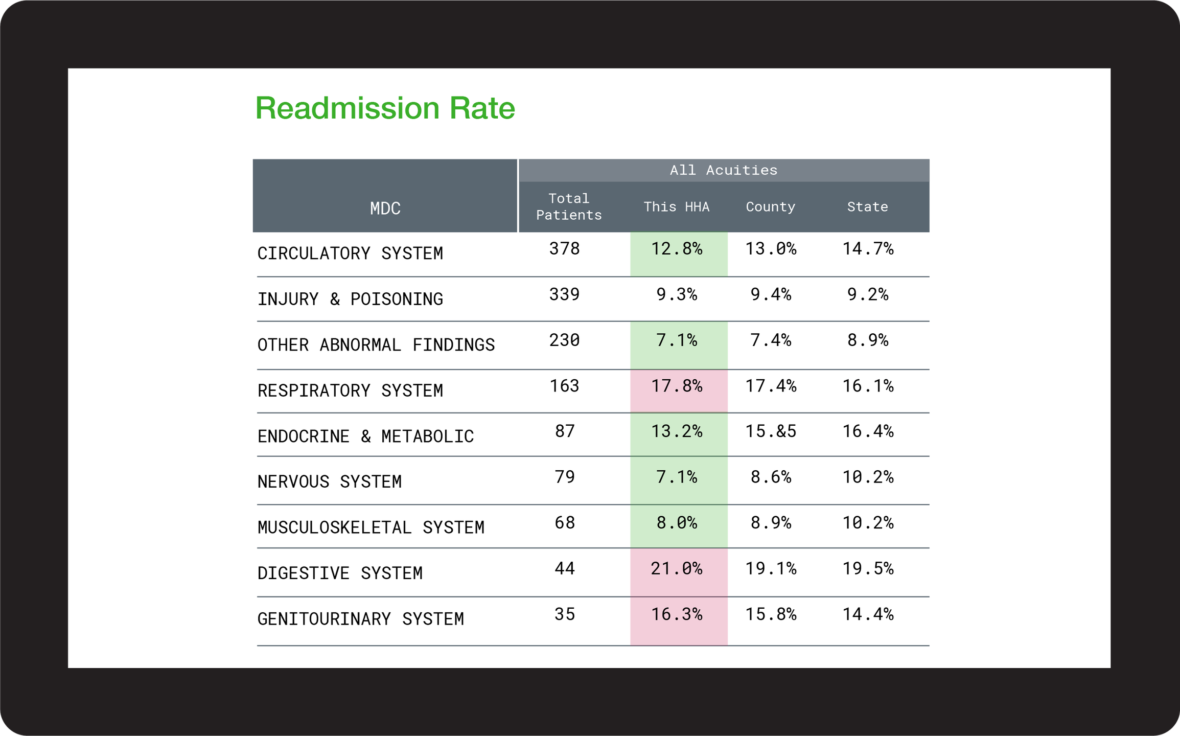 Demonstrate your ability to lower costs and improve patient outcomes. Home Health Agency A can quickly demonstrate how it outperforms Home Health Agency B on hospitalization and readmission rates. Marketscape for Home Health helps you redefine your sales and marketing strategy to ensure you’re focusing on high-potential physician and facility referral sources. Our breakthrough technology and support help you: Quickly evaluate how you compare to your peers by hospital and readmission rates, diagnostic category, acuity level, time to start of care, total cost of care, and many other quality metrics.