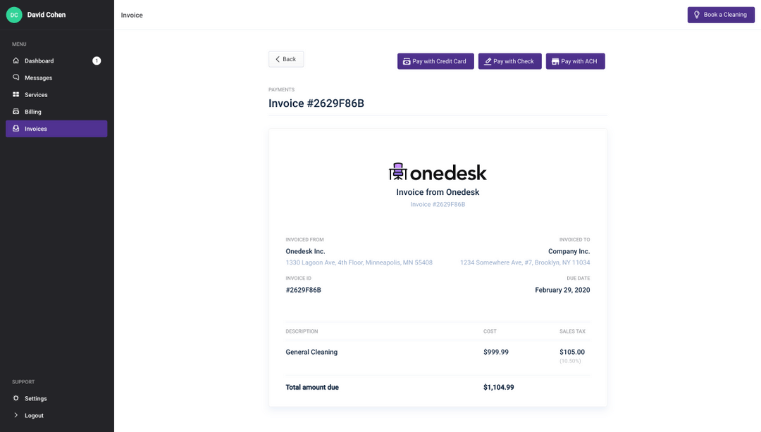 Forget about spending forever looking for new janitorial services and managing them. The Onedesk Platform makes it super simple to request professional commercial cleaning services, communicate with your cleaners, see your schedule and manage all your payments. We'll show you how Onedesk works, get to know your space, and develop a custom plan for you based on your unique needs. Our multiple quote process ensures you get a fair market rate cleaning price for your office that meets your budget. Easily chat with your cleaners, see your service calendar, and manage all your billing through our online dashboard. Your VOA will take you through a tour of the platform, assist in developing a custom cleaning plan that meets your unique needs and make sure you get the most out of your budget. Onedesk guarantees satisfaction for all cleaning services booked on our platform. We ensure our cleaners are responsive, prompt, and deliver quality cleanings at a fair price.