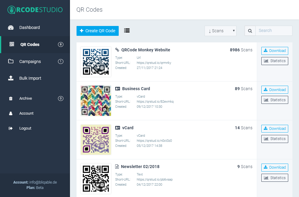 With QRCode Studio you can create dynamic QR codes that can be edited anytime even after being printed. Adapt the content of already published QR codes over time like changing the URL or switching the content type. Dynamic QR codes give you flexibility to avoid invalid QR codes for already published QR code campaigns. Next to the flexible editing you can also track scanning statistics with a dynamic QR code. Ever wondered how successful your QR code campaign is? With QRCode Studio you can easily track the scans of your dynamic QR codes. See statistics about how many people scanned your QR code. Get Insights about country, city and language of your target group. Know the device type, platform and browser of a scan. Detailed scanning information help you improve your QR code campaigns step by step. With our Excel export you can download all your statistics.