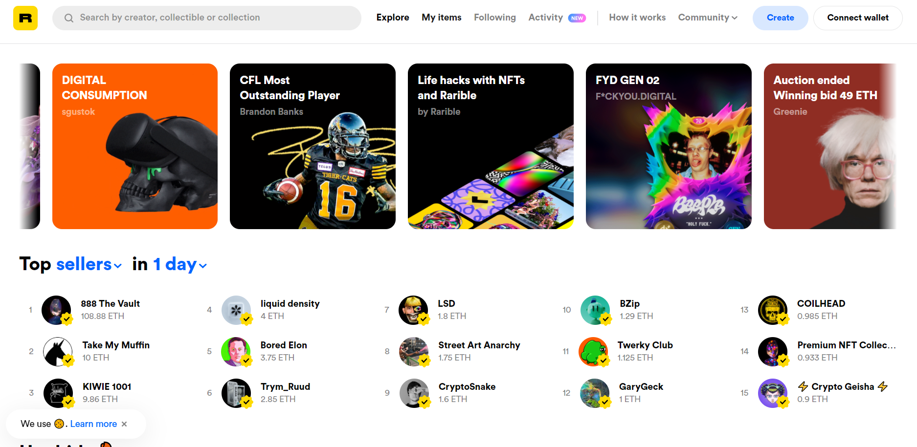 Creator-centric NFT marketplace with a community governance program. The first community-owned NFT marketplace. Create, sell or collect digital items secured with blockchain. NFT stands for non-fungible tokens like ERC-721 (a smart contract standard) tokens which are hosted on Ethereum’s own blockchain. NFTs are unique digital items such as collectibles or artworks or game items. As an artist, by tokenizing your work you both ensure that it is unique and brand it as your work. The actual ownership is blockchain-managed. RARI is the native governance token of the NFT marketplace Rarible, designed to reward active platform users with a voice on the platform's future. As we are growing in numbers and expanding our presence on the market, we decided to take a shift towards a becoming a fully Decentralized Autonomous Organization. RARI has been created to give Rarible community the power to influence decisions and incentivize active participation.
