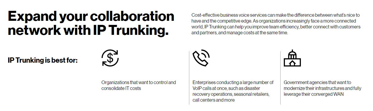 Harness the power of Verizon’s Voice-over-IP (VoIP) network with IP Trunking to give your organization cost-effective, flexible communications. Cost-effective business voice services can make the difference between what’s nice to have and the competitive edge. As organizations increasingly face a more connected world, IP Trunking can help you improve team efficiency, better connect with customers and partners, and manage costs at the same time. Organizations that want to control and consolidate IT costs. Enterprises conducting a large number of VoIP calls at once, such as disaster recovery operations, seasonal retailers, call centers and more. Government agencies that want to modernize their infrastructures and fully leverage their converged WAN. IP Trunking manages voice data over networks instead of traditional phone lines. It’s scaled at a level for organizations and agencies to connect many people at once and to better control costs.