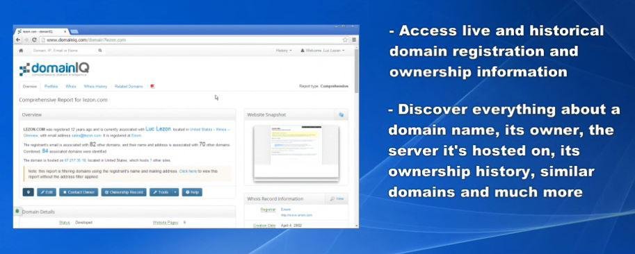 domainIQ is an internet research tool trusted by government agencies, domain investors and legal firms. domainIQ was created to solve the complex problem of finding detailed information about a particular domain name, registrant, web site or server and to present the information in a meaningful and easy to understand format. To do this, we gather the best data, and assemble it in the most intelligent way possible. Our reporting infrastructure stores and processes billions of data points from a wide variety of sources and uses it to generate reports that are unmatched in depth, detail and accuracy. Our easy to use and flexible reporting tools allow you to generate comprehensive reports, instantly, and at a fraction of the price charged by competitors. The reporting and visualization tools offered on domainIQ are unique to our service and not available on any competing site.