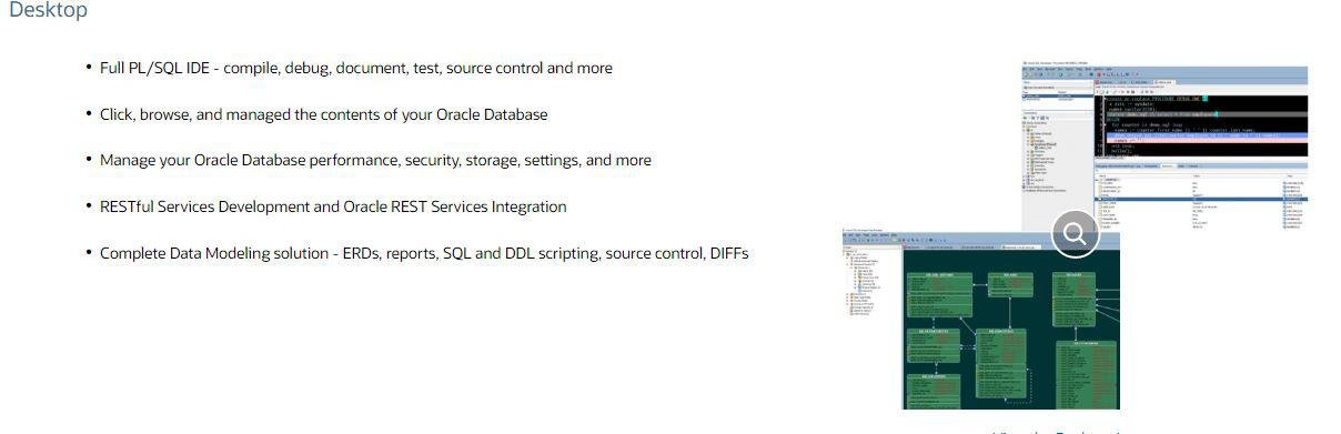 Oracle SQL Developer is a free, integrated development environment that simplifies the development and management of Oracle Database in both traditional and Cloud deployments. SQL Developer offers complete end-to-end development of your PL/SQL applications, a worksheet for running queries and scripts, a DBA console for managing the database, a reports interface, a complete data modeling solution, and a migration platform for moving your 3rd party databases to Oracle. Run your sql and sql scripts, manage users, create and edit objects, import data to new or existing tables, diagnose performance issues, visualize your schemas, and much more. The power of your favorite desktop tool, in your browser. Available with Oracle REST Data Services for your on-premises instances. Migrate Oracle On-Premises to Oracle Cloud. Click, browse, and managed the contents of your Oracle Database.
