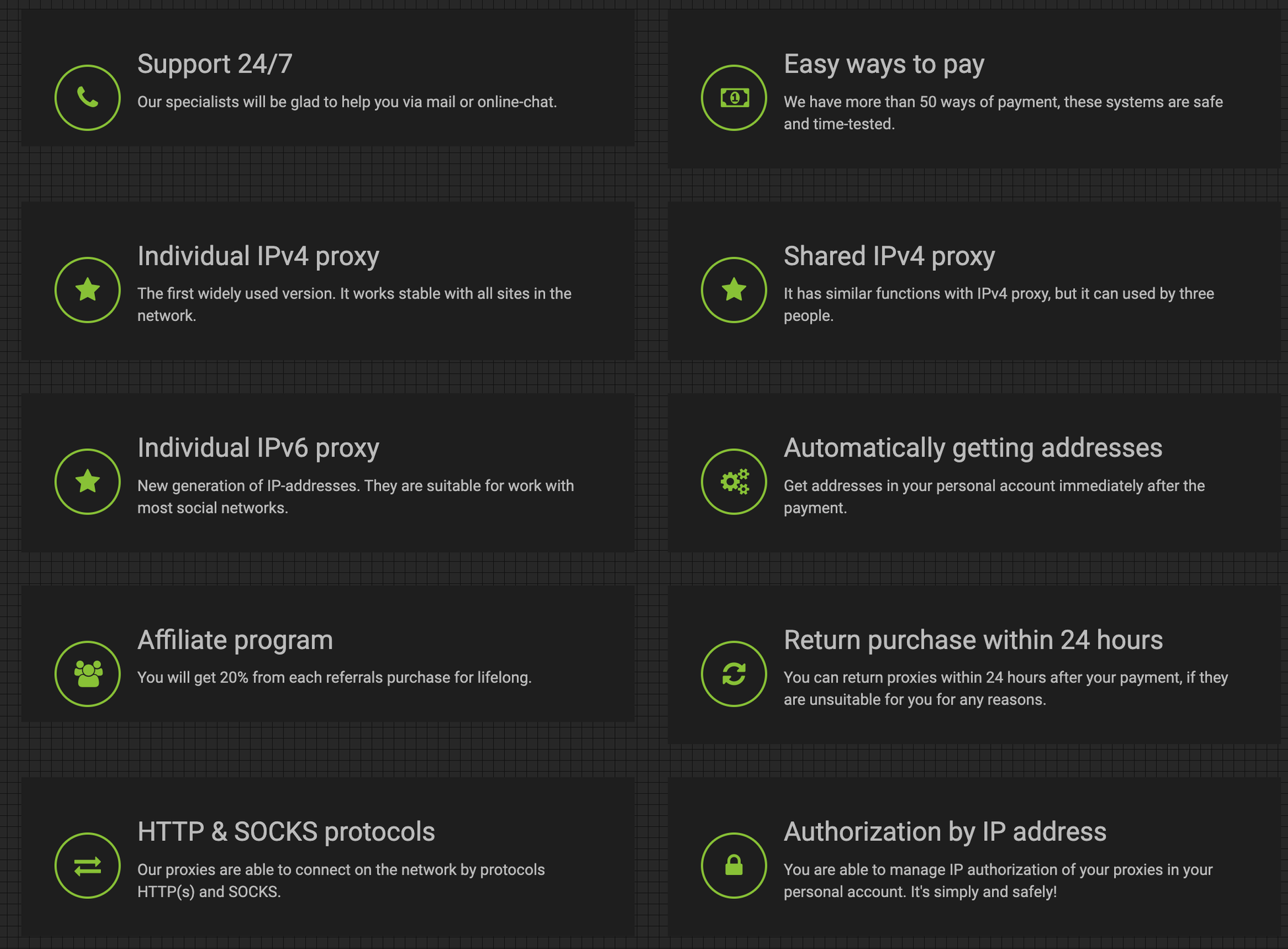 We provide secure and anonymous proxy. High-performance and high-speed channel of service allow our customers to work 24/7 with us without worrying about crashes and any problems.