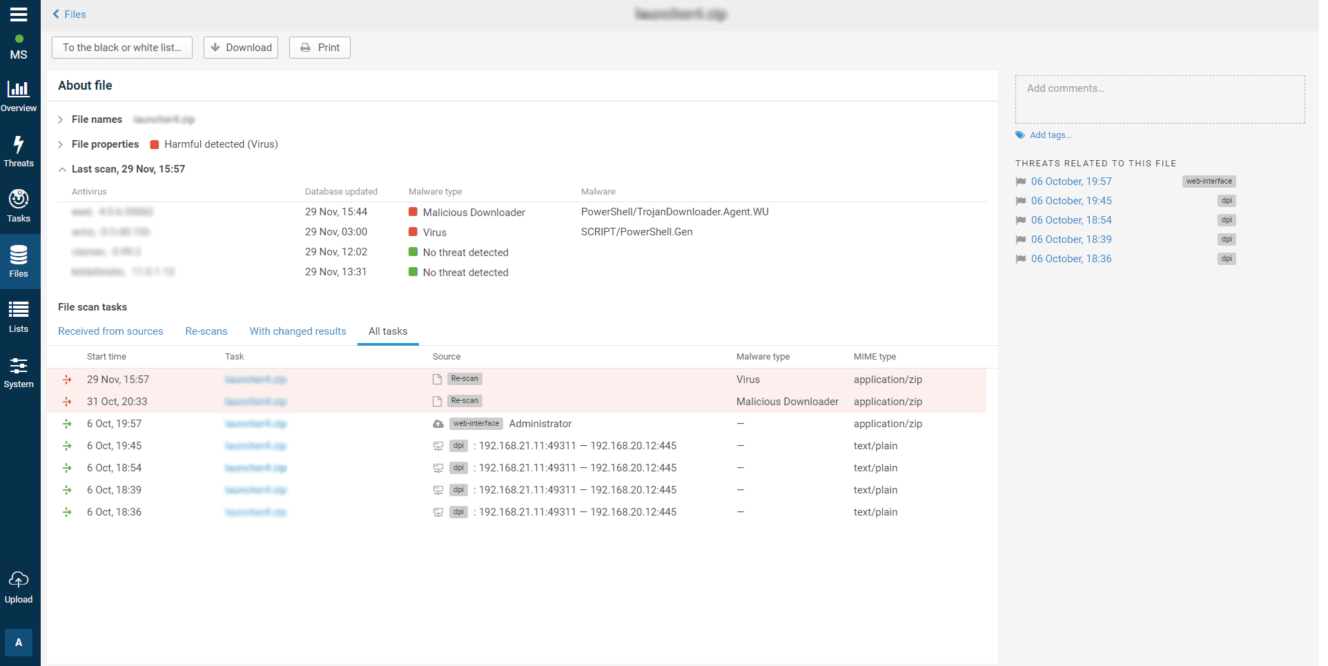 PT MultiScanner provides multiple levels of anti-malware protection to detect and block infections on corporate infrastructure, uncover hidden threats, and facilitate investigation of malware-related security incidents. Counting on the same antivirus vendor to be right every time? Draw on the best anti-malware vendors and Positive Technologies expertise instead. Extensive integration support and scalability make PT MultiScanner the right choice for both startups and the largest corporations. Suspicious objects are scanned with multiple anti-malware engines, static analysis, and Positive Technologies reputation lists. The solution supports scanning of files and archives, including recursively compressed ones. As a result, PT MultiScanner can spot and block malware far more effectively than any one method used in isolation.