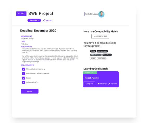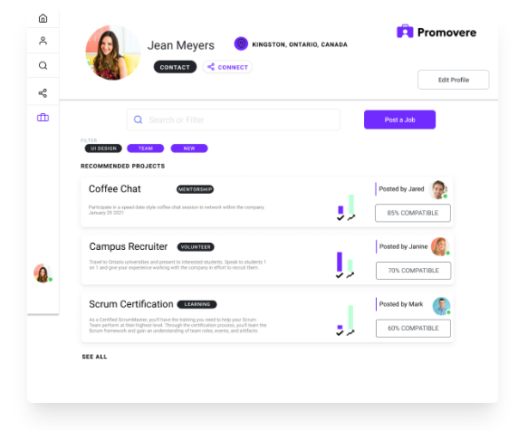 Connecting projects to employees that balance their skill qualifications, and skill growth aspirations. We intelligently match jobs, mentors, and career paths to employees based on their goals, and aspirations. Identifying projects that match your growth aspirations, so we can help you develop in the most efficient way possible. Communicate opportunities across your organization effortlessly, with one-to-many postings. A proper system to foster and encourage growth opportunities. Manage each employee's individual career path, goals, and aspirations in one place. Enables innovative projects that are internal to your company to be connected effectively with the employees who are passionate about achieving it. Promovere is a digital marketplace for businesses that increases employee engagement, retention, and growth. Employees are happier and more likely to grow within your company. With employees that are more engaged, work quality is improved, and more ambitious work is executed.
