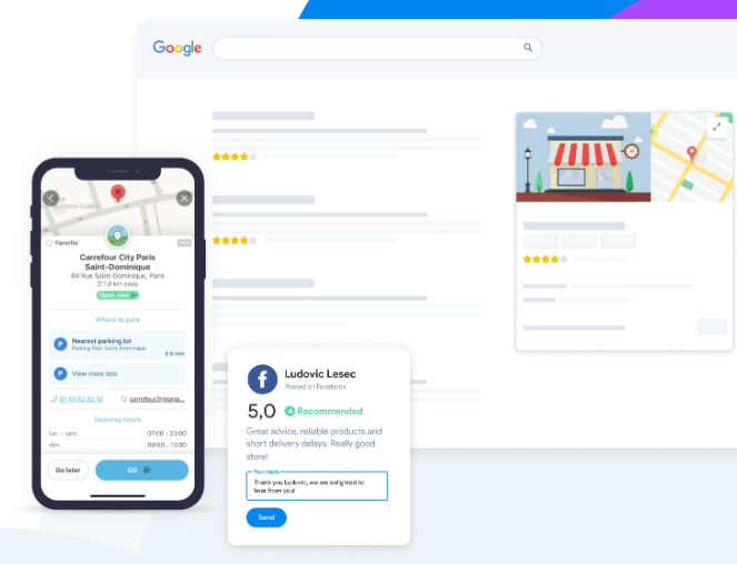Let’s develop together your online visibility and your e-reputation to attract new customers to your points of sale! Automatically distribute information about your establishments on major directories, GPS, search engines, social networks, and review sites. Centralize the reviews left on your establishments whether they come from Google, Facebook, or TripAdvisor. Get regular reports, analyze them and respond to them from a single interface. Encourage your satisfied customers to leave you positive reviews on Google Business Profile. Optimize your website with a store locator and customizable pages per location. Make your point of sales stand out on the queries associated with your activity. Centralize messages received on Google Business Profile and easily reply to them centrally or locally. Let’s develop together your online visibility and your e-reputation to attract new customers to your points of sale!