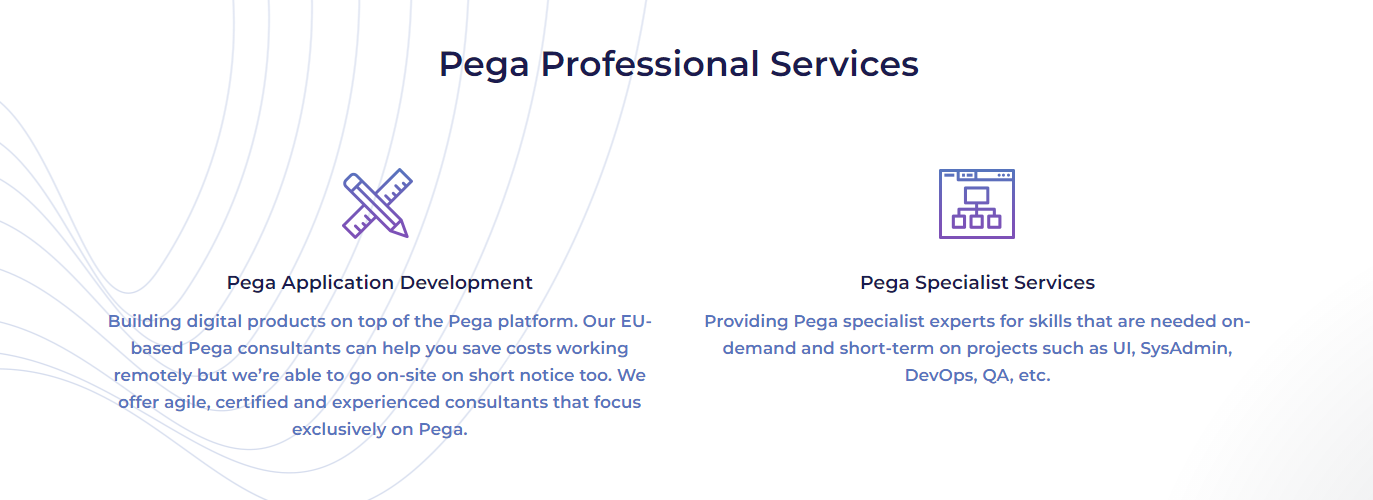 We enable digital transformation by delivering end-to-end solutions with Pega’s technology. As an official Pega partner company, we leverage the technology to build digital process automation (DPA) and customer relationship management (CRM) applications for enterprise clients in various industries. We believe in creating value by following agile, lean and design thinking principles. Pega is the leader in cloud software for customer engagement, customer service, and digital process automation. The world’s most recognized brands rely on Pega’s AI-powered software to optimize every customer interaction on any channel while keeping their brand promises. Pega’s low-code application development platform allows enterprises to quickly build and evolve apps to meet customer and employee needs and drive digital transformation globally. Pega enables higher customer satisfaction, lower costs, and increased customer lifetime value.