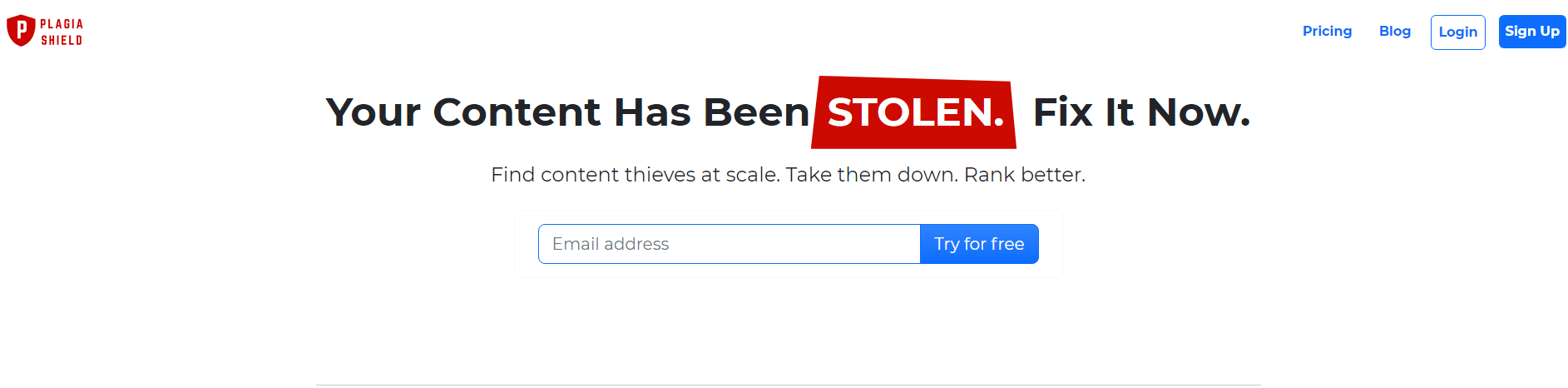 Find all content thefts. Get rid of them. Rank better. Content Is King, right? High-quality, unique written posts are one of your best assets. The truth is, your articles are most probably not unique anymore. You would be surprised how quickly they got copied by dozens of websites. Your blog posts lost their value when they went from original to ordinary. Google likes original posts You might be okay with having your exact content copied hundreds of times. Google is not. It takes it into account when ranking pages. After each core SERP algorithm update, the first question you should ask yourself is: "Does the content provide original information, reporting, research or analysis?" (see the full Google note). Being copied is painful enough Fighting content thefts shouldn't be Your content is precious. And so is your time. PlagiaShield is the plagiarism checker that helps you get rid of all copycats in the most efficient way. In a few minutes, find the most fraudulent domains.