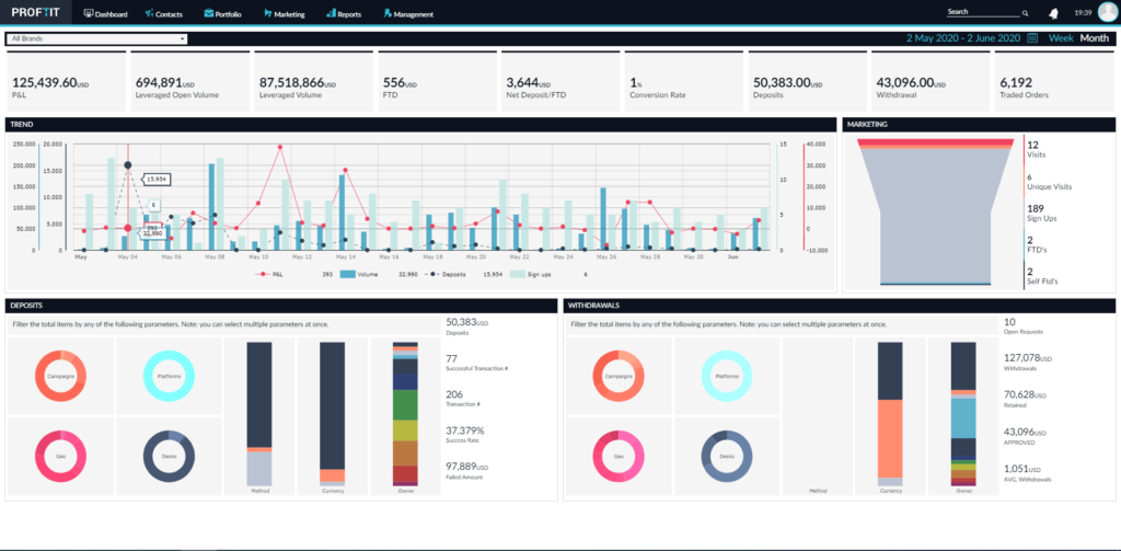 Proftit is a leading provider of innovative solutions for Forex and CFD brokers, prop trading firms, and multi-asset trading businesses. Designed with brokers in mind, Proftit’s SPOT-on CRM (Single Point of Truth) streamlines operations, consolidates client interactions, and enhances scalability. Offering seamless integration with leading trading platforms and payment systems, Proftit delivers turnkey solutions, including high-performance CRM, trading platforms, and prop trading technology to over 300 organizations worldwide. Built on cutting-edge infrastructure with top-tier security, Proftit ensures reliability, compliance, and growth for businesses of all sizes. With Proftit, brokers can launch, manage, and scale their operations effortlessly while focusing on driving success and profitability.