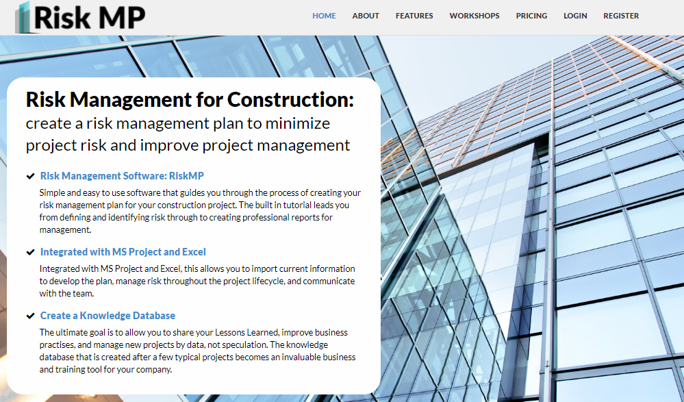 Create a risk management plan to minimize project risk and improve project management. Simple and easy-to-use software that guides you through the process of creating your risk management plan for your construction project. The built-in tutorial leads you from defining and identifying risk through to creating professional reports for management. Integrated with MS Project and Excel, this allows you to import current information to develop the plan, manage risk throughout the project lifecycle, and communicate with the team. The ultimate goal is to allow you to share your Lessons Learned, improve business practices, and manage new projects by data, not speculation. The knowledge database that is created after a few typical projects becomes an invaluable business and training tool for your company. Risk management is a cornerstone of good project management practice. RiskMP is a tool that make risk management a simple, efficient process, from estimating through to project completion.