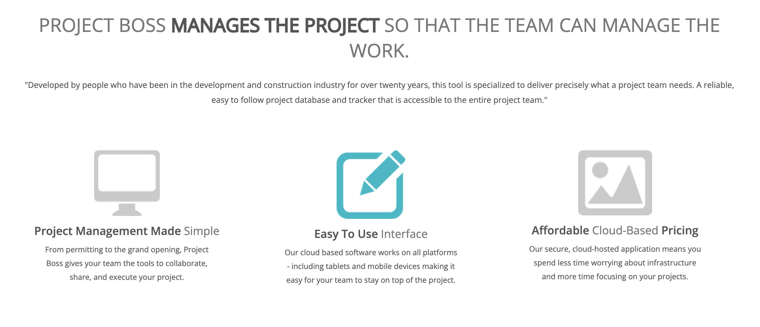 Developed by people who have been in the development and construction industry for over twenty years, this tool is specialized to deliver precisely what a project team needs. A reliable, easy to follow project database and tracker that is accessible to the entire project team. From permitting to the grand opening, Project Boss gives your team the tools to collaborate, share, and execute your project. Our cloud based software works on all platforms - including tablets and mobile devices making it easy for your team to stay on top of the project. Our secure, cloud-hosted application means you spend less time worrying about infrastructure and more time focusing on your projects.