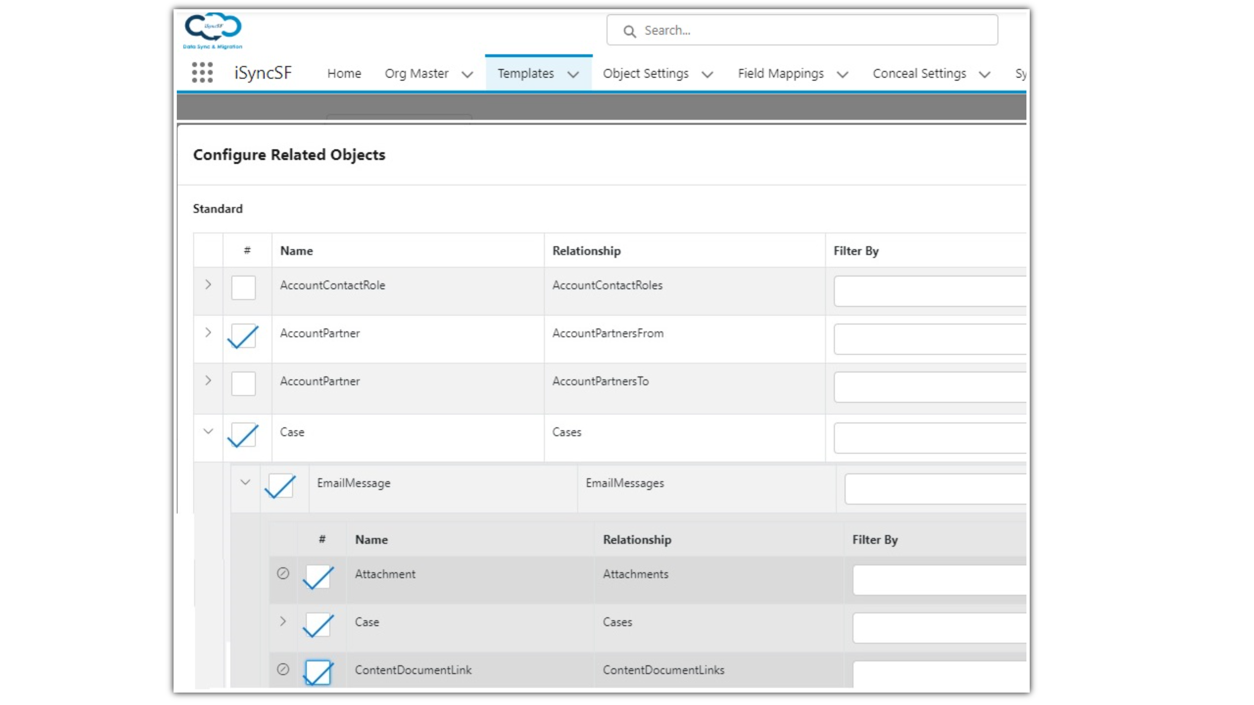 iSyncSF will provide templates for all popular apps like Salesforce CPQ/Billing, Apttus/Conga CPQ/CLM/AWA/Composer, Financial Force, and many more. With these templates, Users can start using an application from day one.