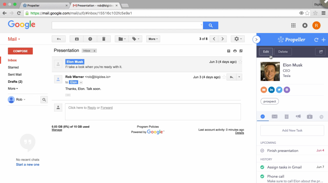 Propeller is a powerful, simple CRM built for Gmail and Google Apps. Perfect for sales and marketing teams, Propeller lets users focus on leads, not data entry. Not only does Propeller integrate with Gmail, it also offers support for multi-step email campaigns, multiple sales pipelines, tools for task and activity management, as well as metrics and reporting.