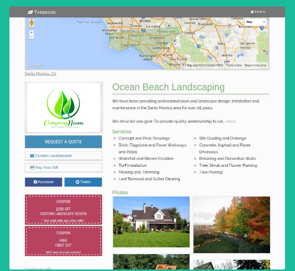 Promote services, manage customer data, generate estimates, schedule jobs, manage billing, and much more. Schedule one job at a time or repeat. Automatically notify customers. Track your job completion in real-time. One-click route optimization. Create new relationships with your customers that keep them coming back. Target specific neighborhoods. Enable credit card payments and get paid faster. Swap referrals with other contractors. Offer seasonal coupons to your customers. Estimates, automated invoicing, and everything in between. Get more high-quality leads and referrals. Benefit from key features in minutes. Easily accept credit card payments.