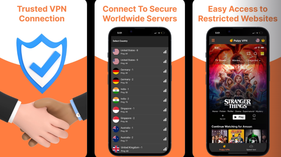 Experience the freedom of secure and anonymous browsing with Pulpy VPN just one tap away. Pulpy VPN encrypts your internet connection, ensuring that third parties can't track your online activity, making it more secure than a typical proxy, especially when using public free Wi-Fi. Pulpy VPN's global VPN network spans across America, Europe, Asia, and many more countries. You can connect to the fastest VPN servers to enjoy secure browsing and unlock all global content. Experience lightning-fast internet speeds with unlimited bandwidth, and safeguard your online privacy while easily bypassing any internet censorship with Pulpy VPN. Connect securely on any network with Pulpy VPN, whether it's Wi-Fi, 5G, LTE/4G, or 3G. Shield your online activities from potential hackers and unwanted intrusion. The automatic server selection is based on geographic location, network speed, capacity, and load for the best connection.